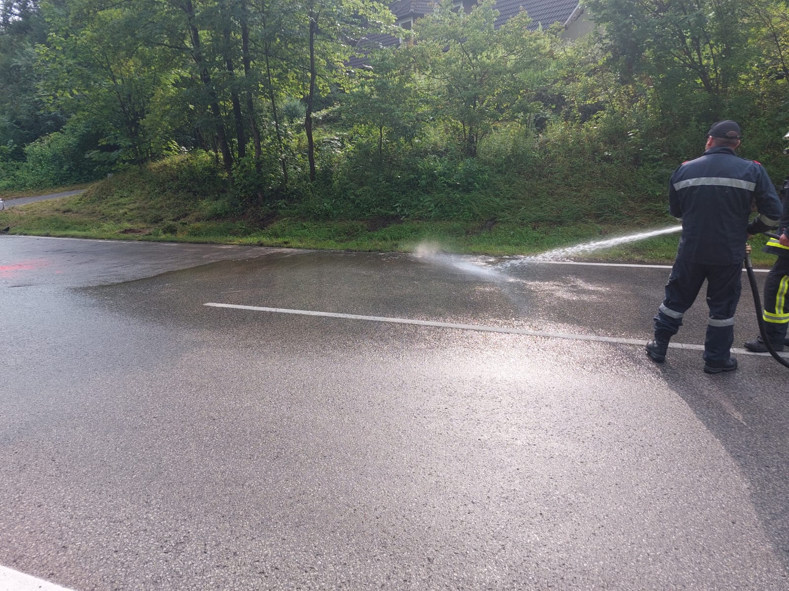 Mittels Schlaufe wurde das Unfallfahrzeug aus dem Gefahrenbereich entfernt, die Fahrbahn von groben Teilen befreit und anschließend mit dem Hochdruckschlauch gereinigt.