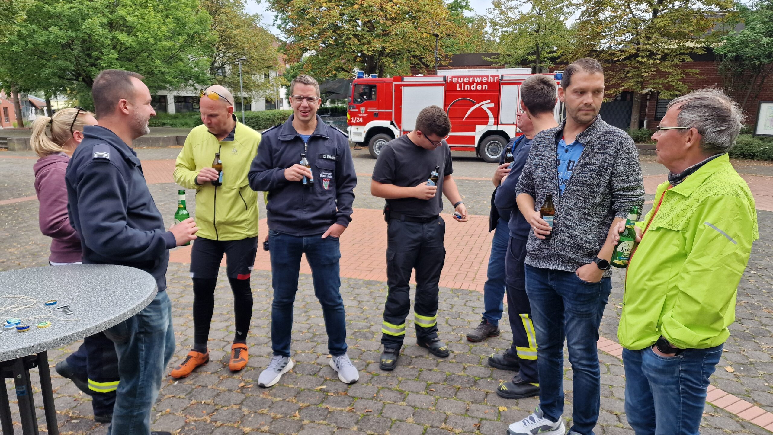 Foto 8 – Feuerwehrkommandant Dennis Braun und Bürgermeister Fabian Wedemann mit Feuerwehrmitgliedern und Altbürgermeister Dr. Ulrich Lenz