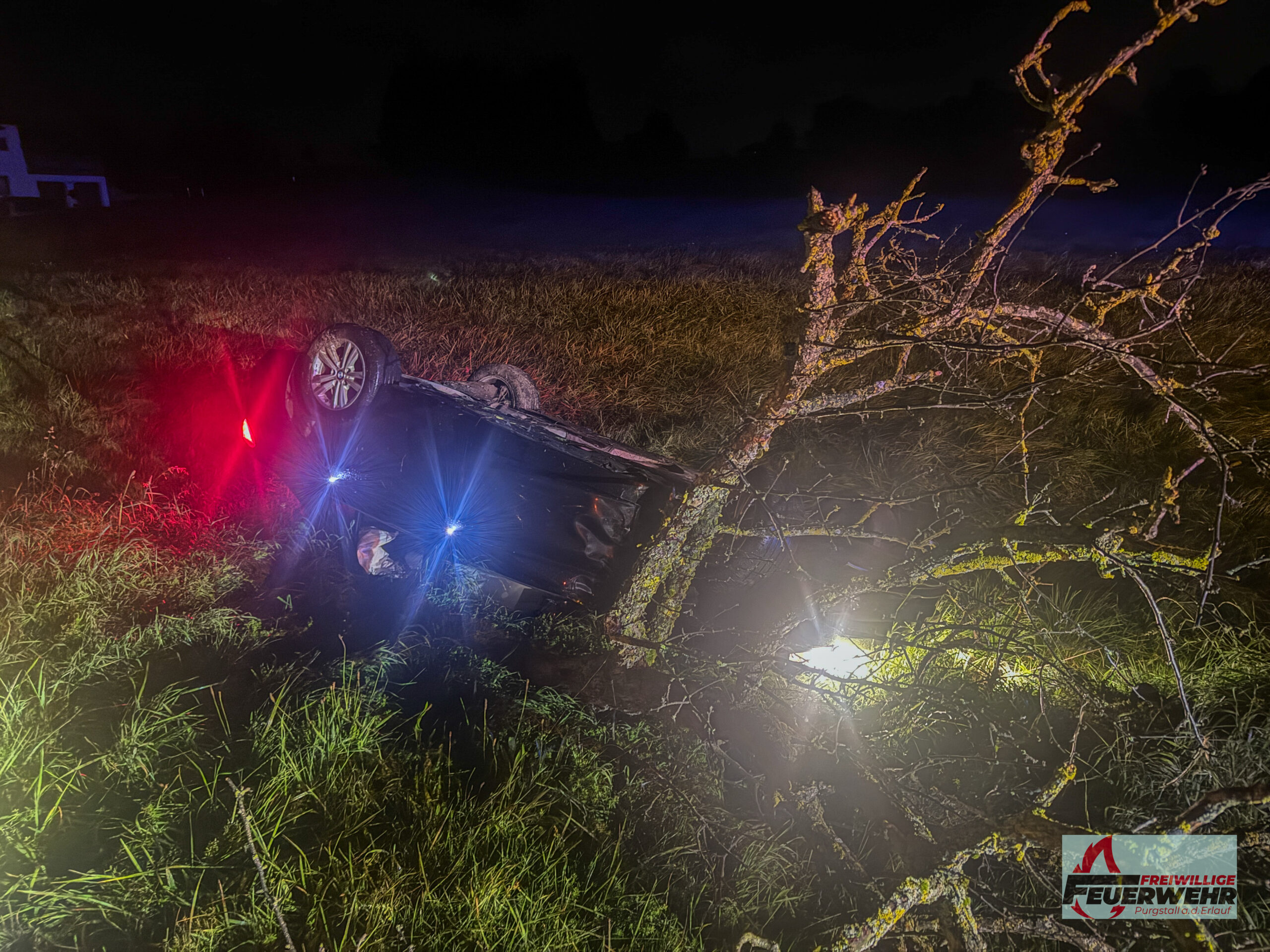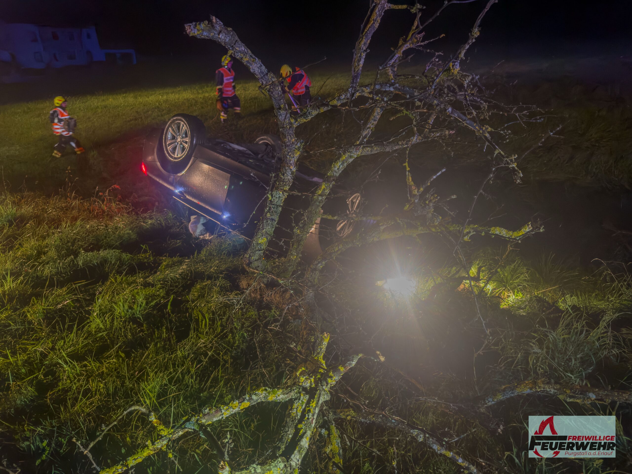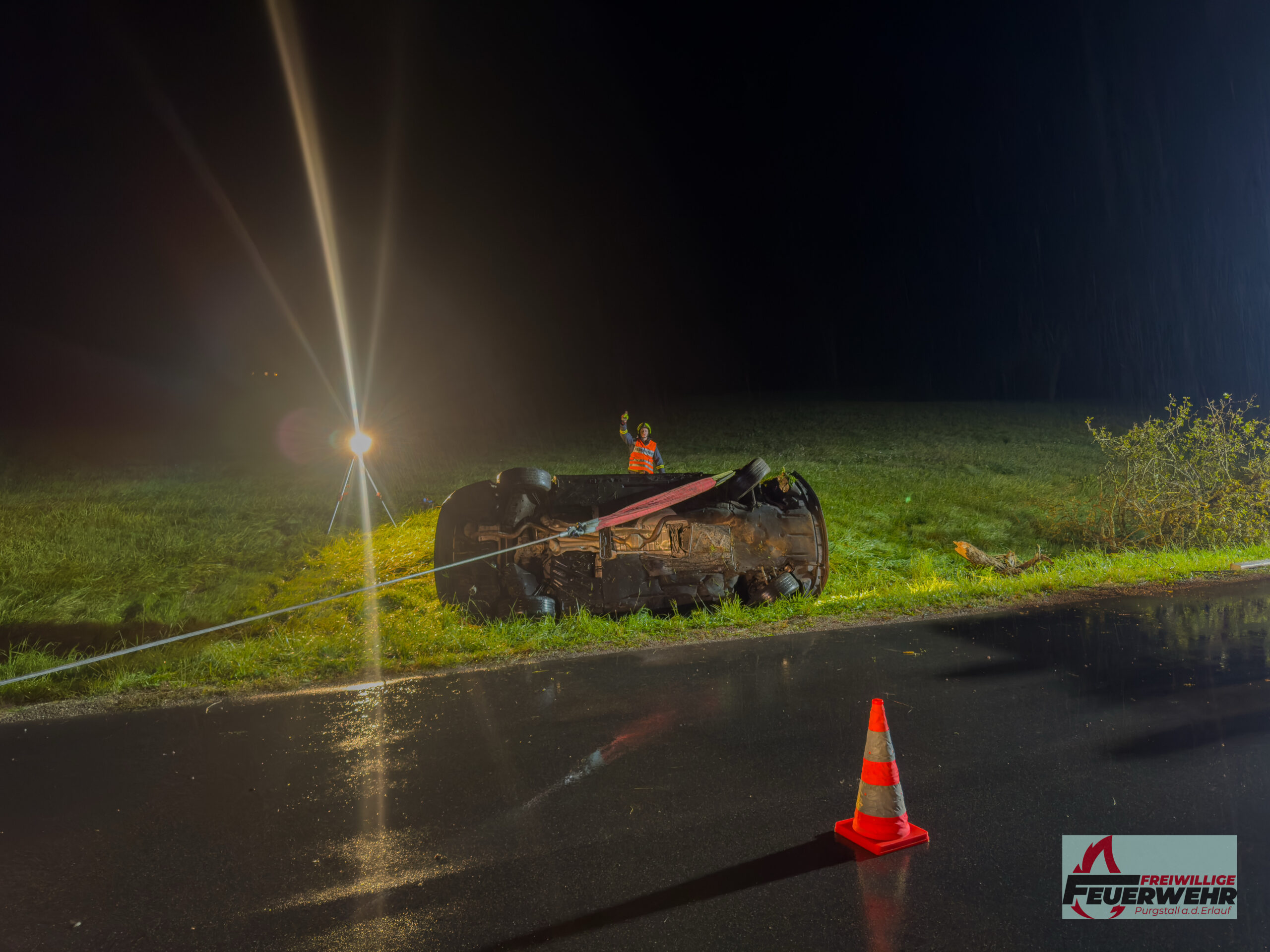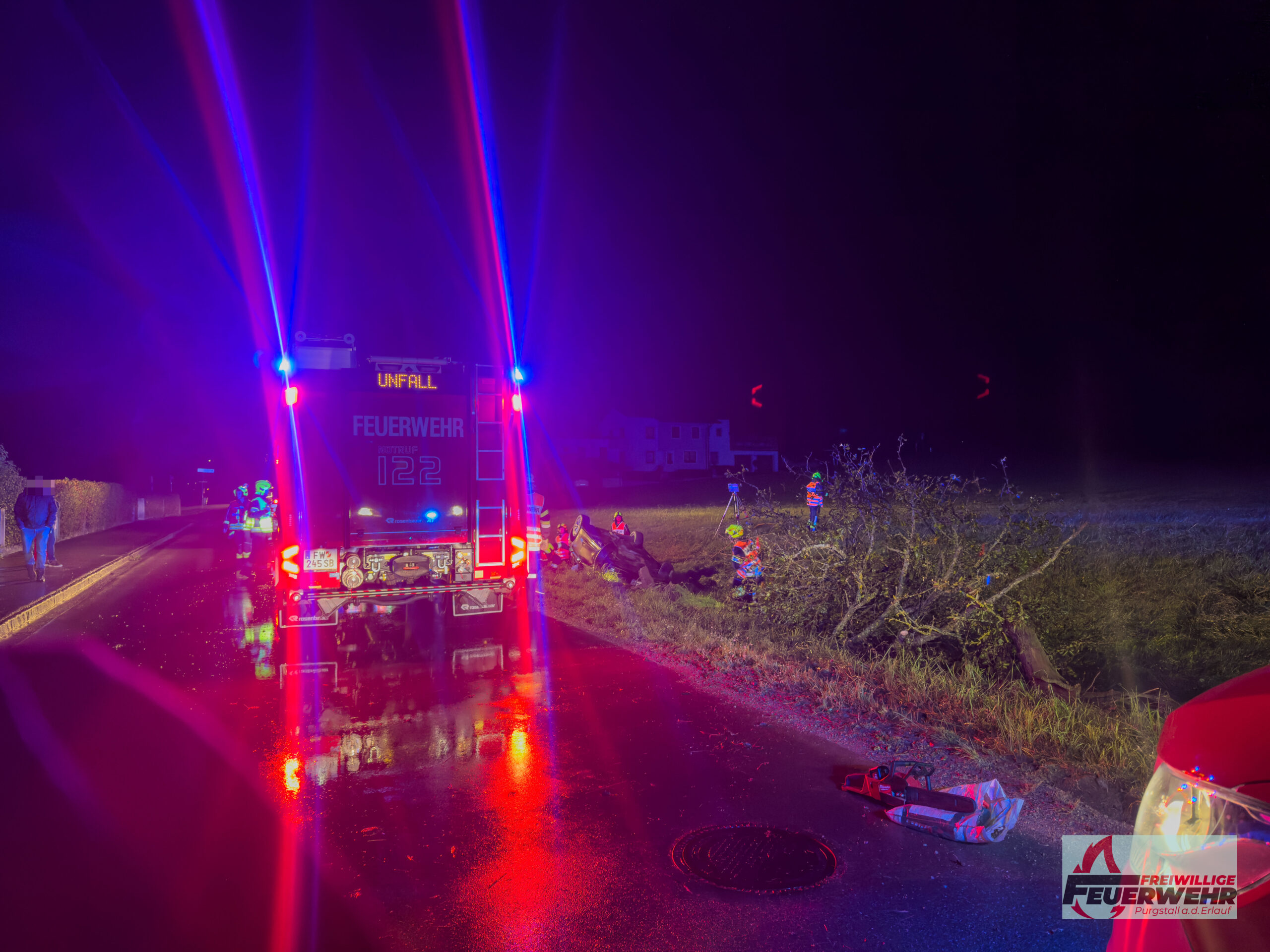 Am Sonntagabend, dem 5. Oktober 2025, wurde die Feuerwehr Purgstall um 20:41 Uhr zu einem Verkehrsunfall auf der Feichsenstraße, kurz vor der Kreuzung Höfl, alarmiert. Ein Pkw kam auf der regennassen Fahrbahn ins Schleudern, prallte gegen zwei Bäume und überschlug sich. Das Fahrzeug blieb auf dem Dach in einem Graben liegen.