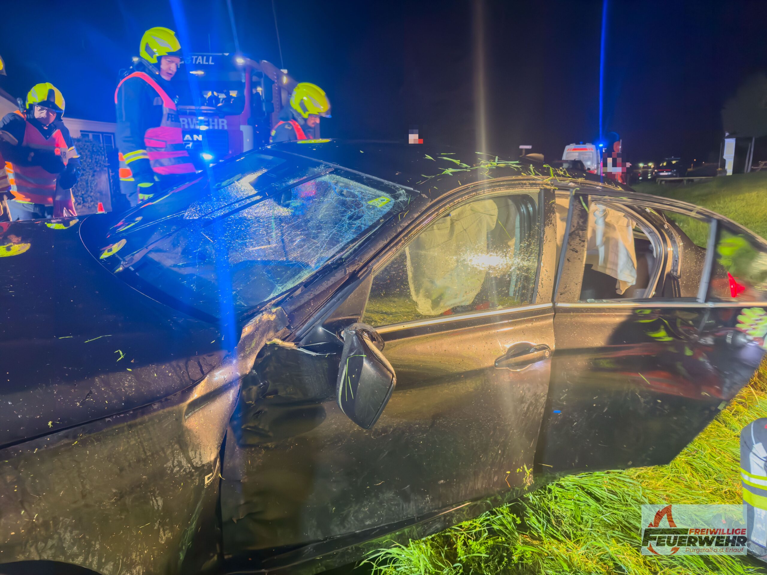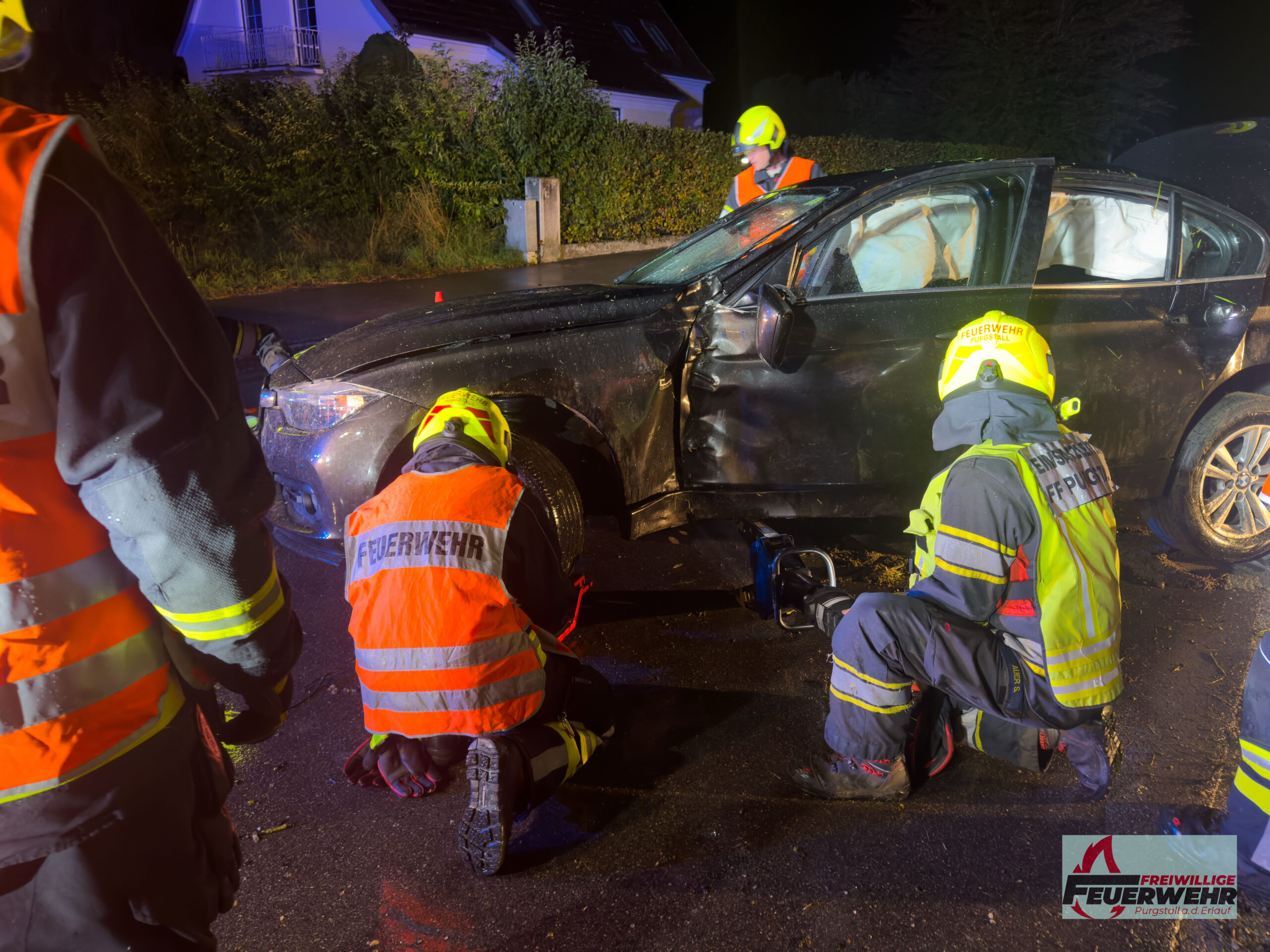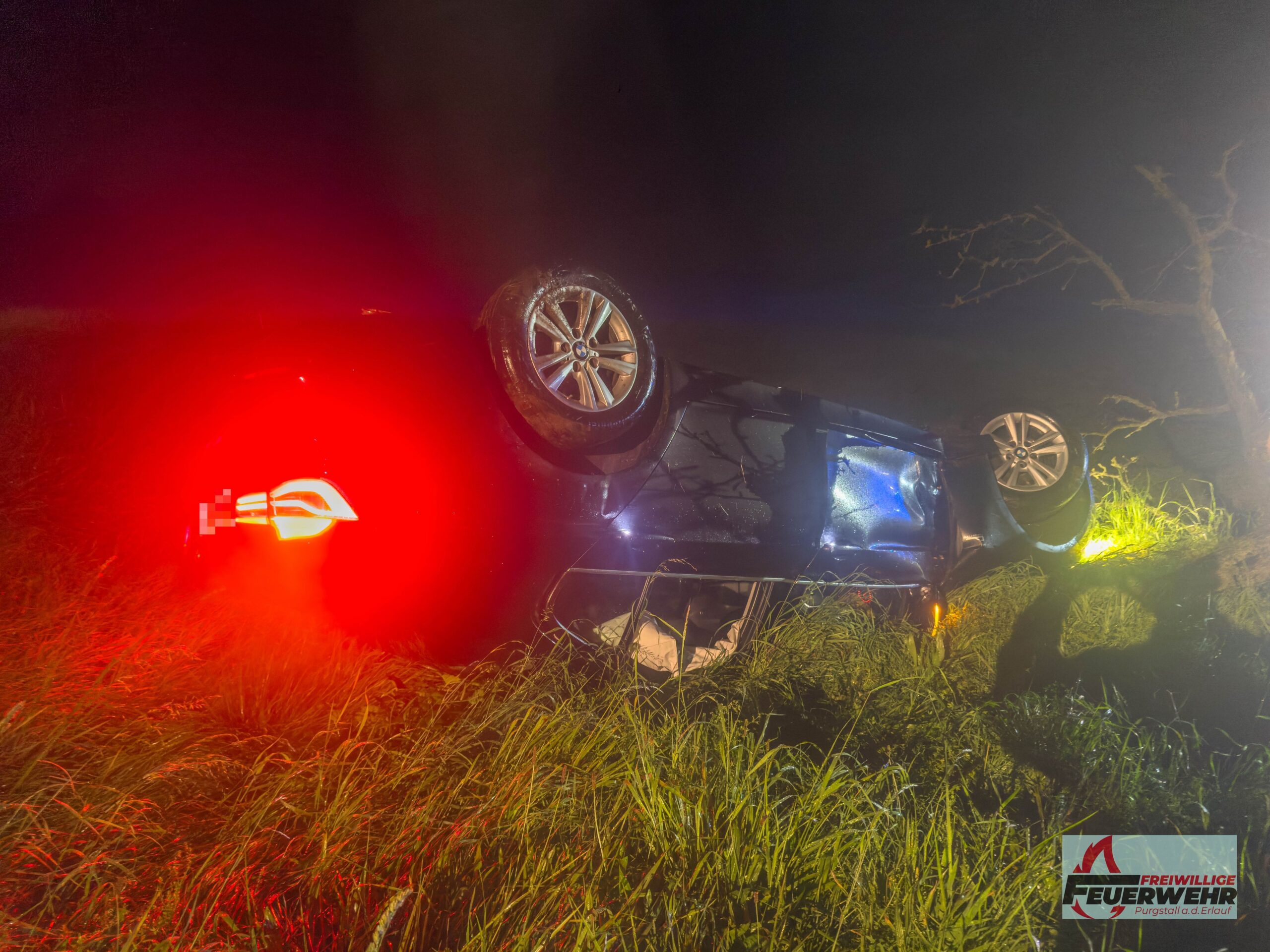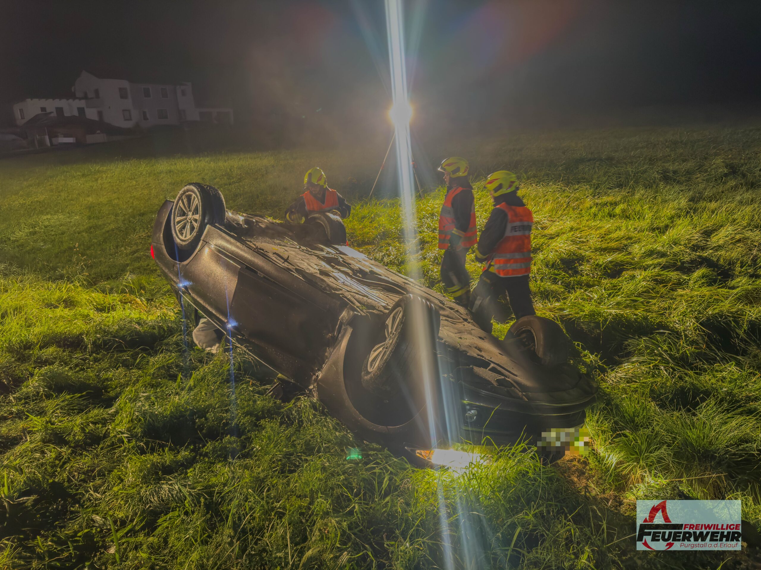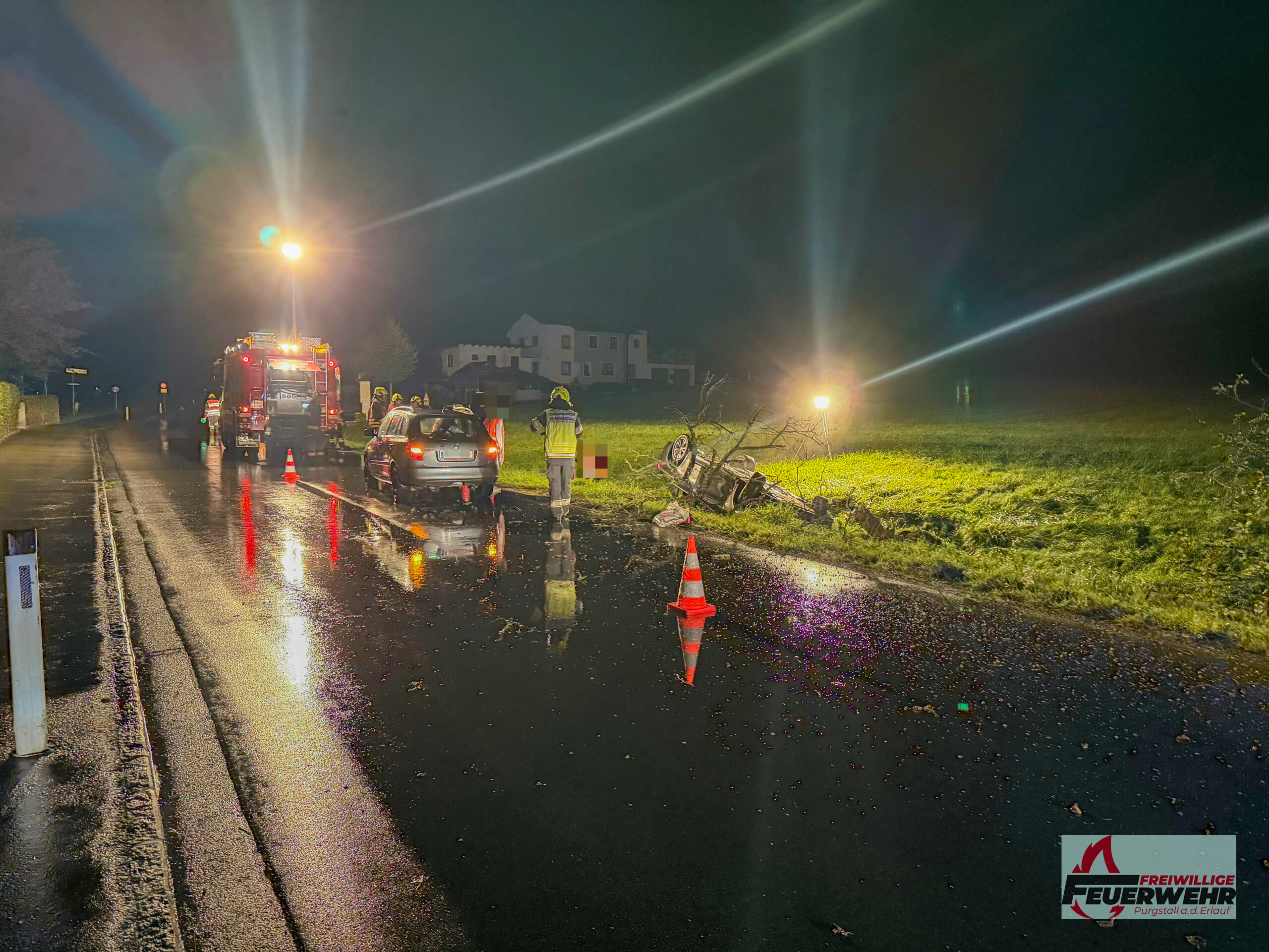 Am Sonntagabend, dem 5. Oktober 2025, wurde die Feuerwehr Purgstall um 20:41 Uhr zu einem Verkehrsunfall auf der Feichsenstraße, kurz vor der Kreuzung Höfl, alarmiert. Ein Pkw kam auf der regennassen Fahrbahn ins Schleudern, prallte gegen zwei Bäume und überschlug sich. Das Fahrzeug blieb auf dem Dach in einem Graben liegen.