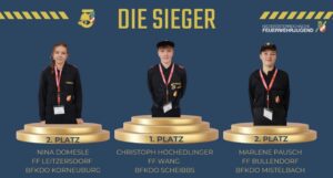 Mit der vollen Punkteanzahl (300 Punkte) und den maximal möglichen 16 Zeitgutpunkten sicherte sich Christoph Hochedlinger von der Feuerwehr Wang den 1. Platz unter 296 Teilnehmerinnen und Teilnehmern aus ganz Niederösterreich.