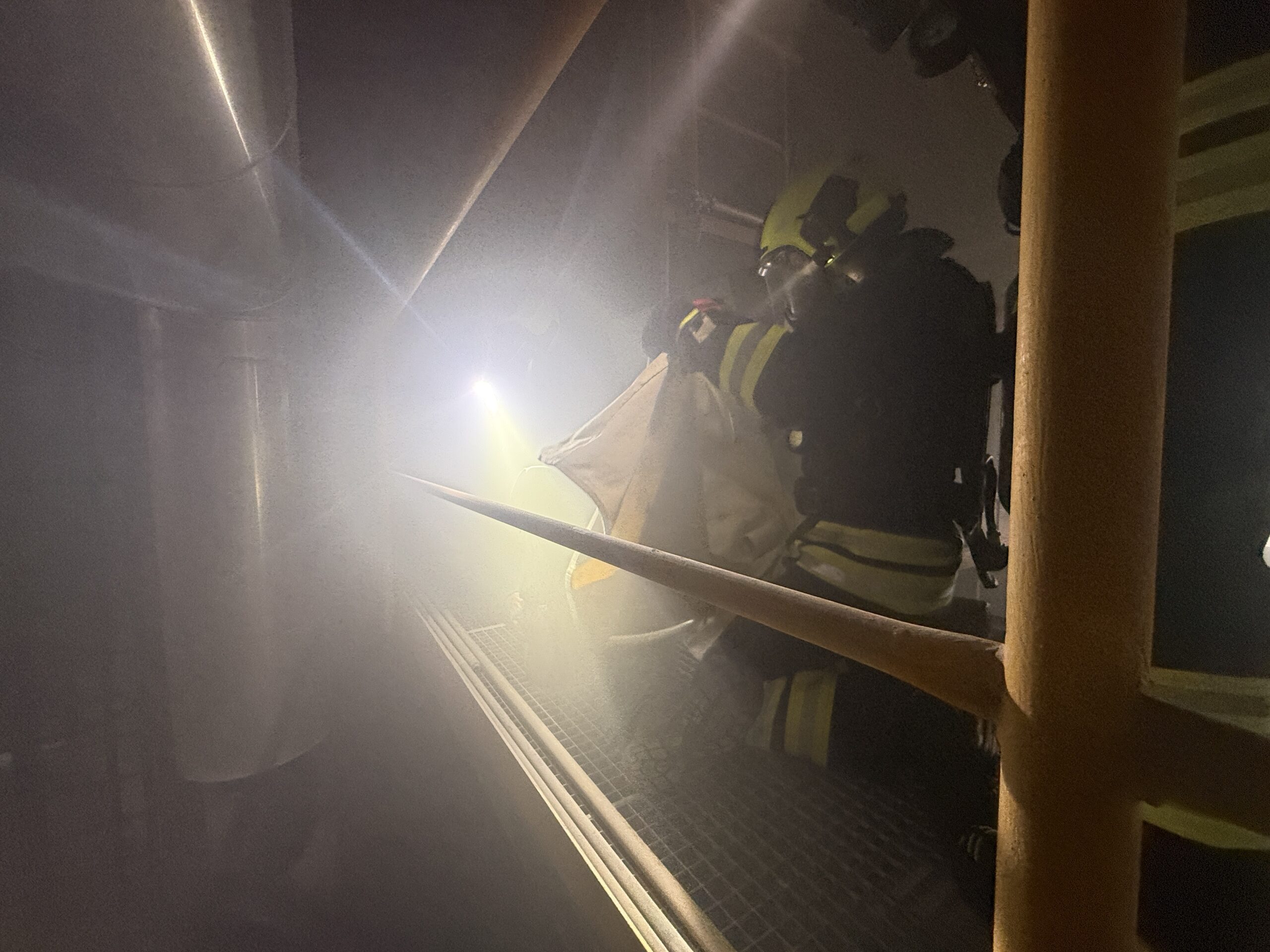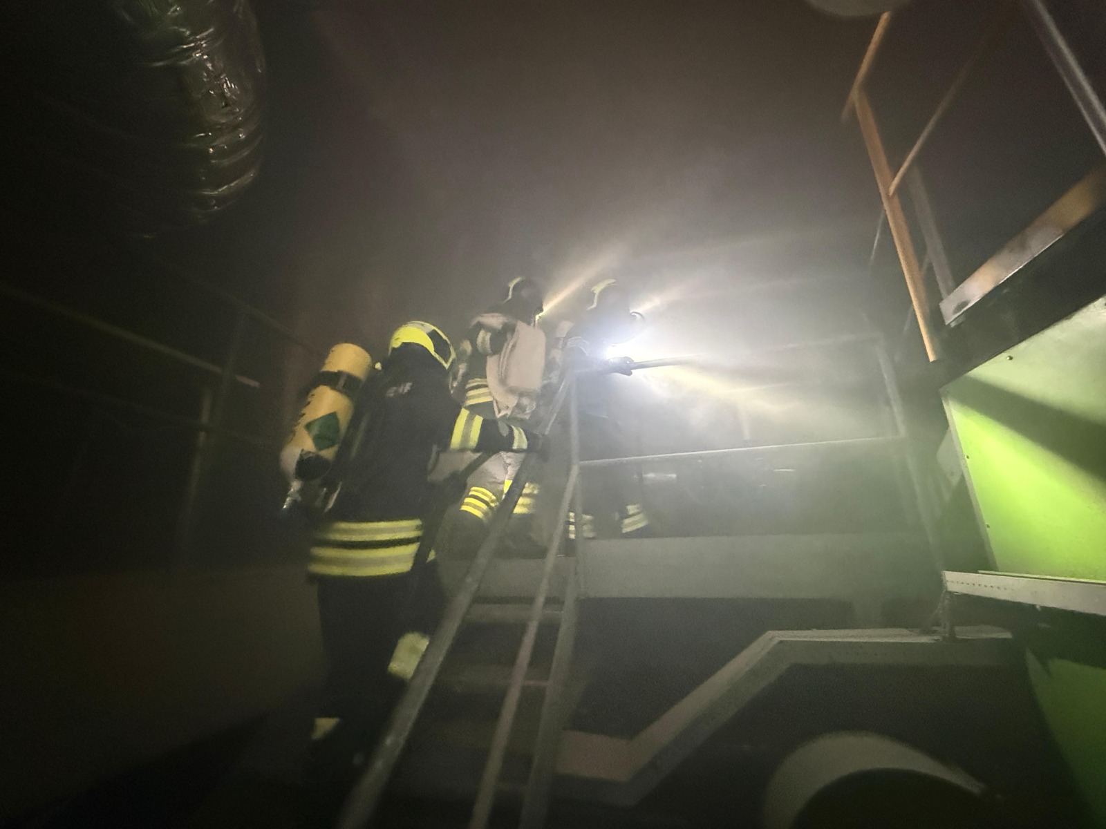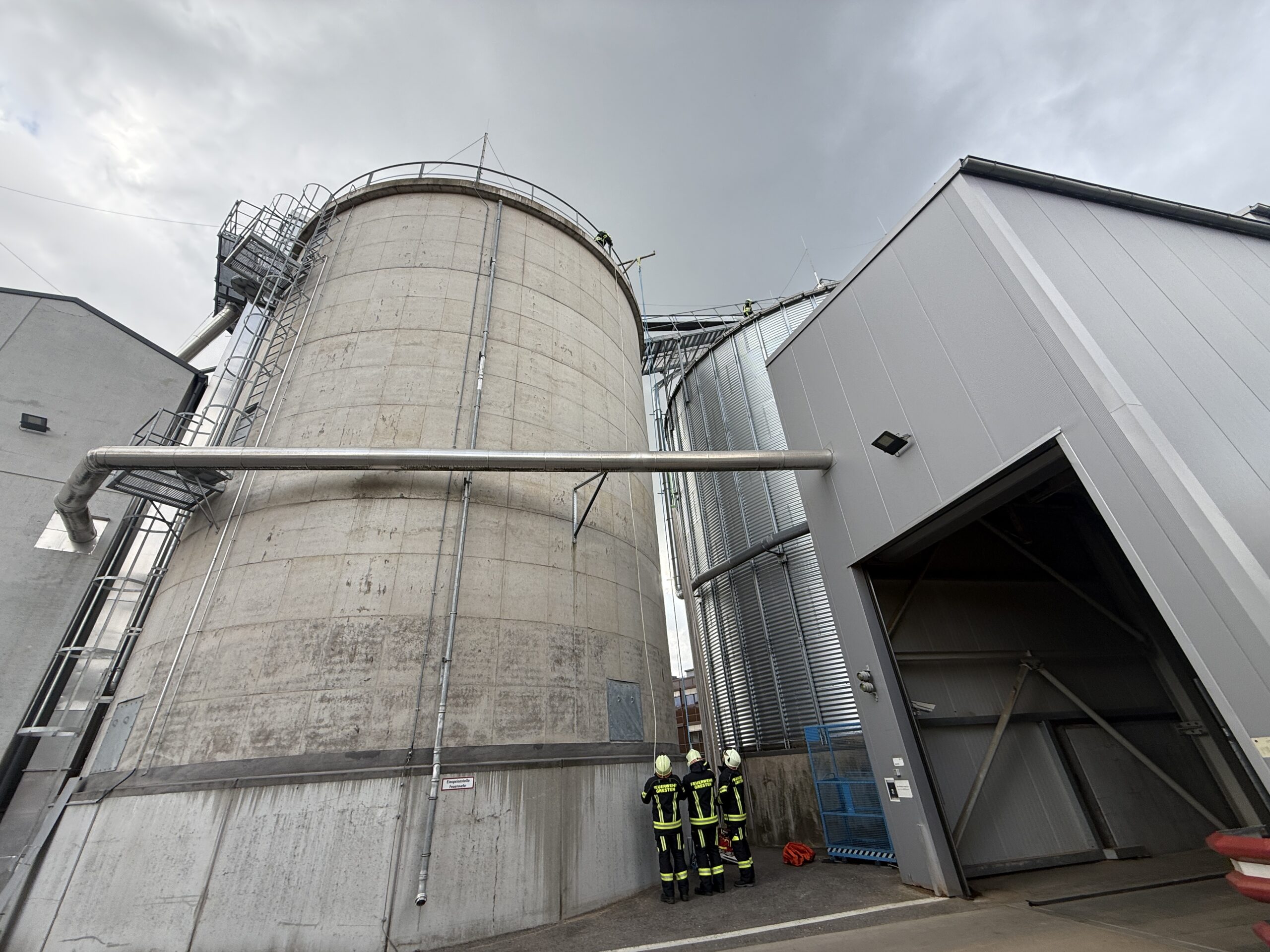 Angenommen wurde, dass es bei Elektroarbeiten in einem Obergeschoss zu einem Brand mit starker Rauchentwicklung kam. Ein Mitarbeiter, welcher sich auf einem Silo befand, bemerkte das Unglück und verständigte die Einsatzkräfte, konnte jedoch nicht mehr selbstständig vom Silo herunter.