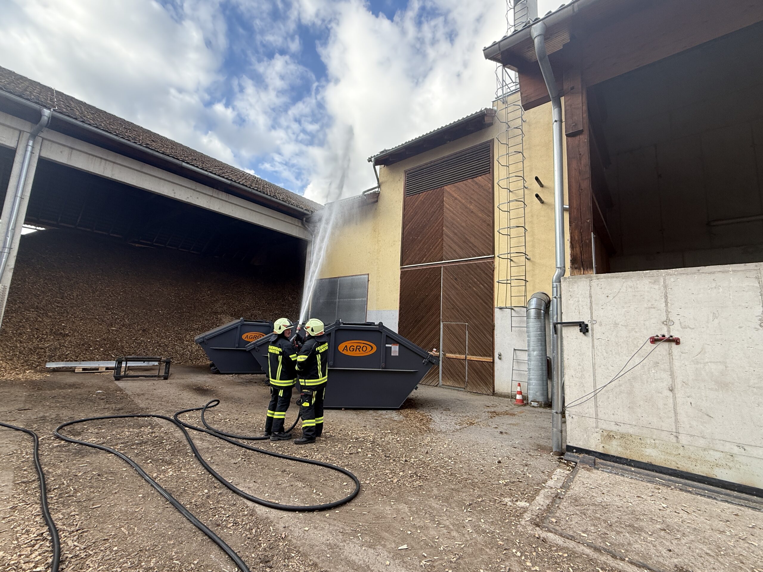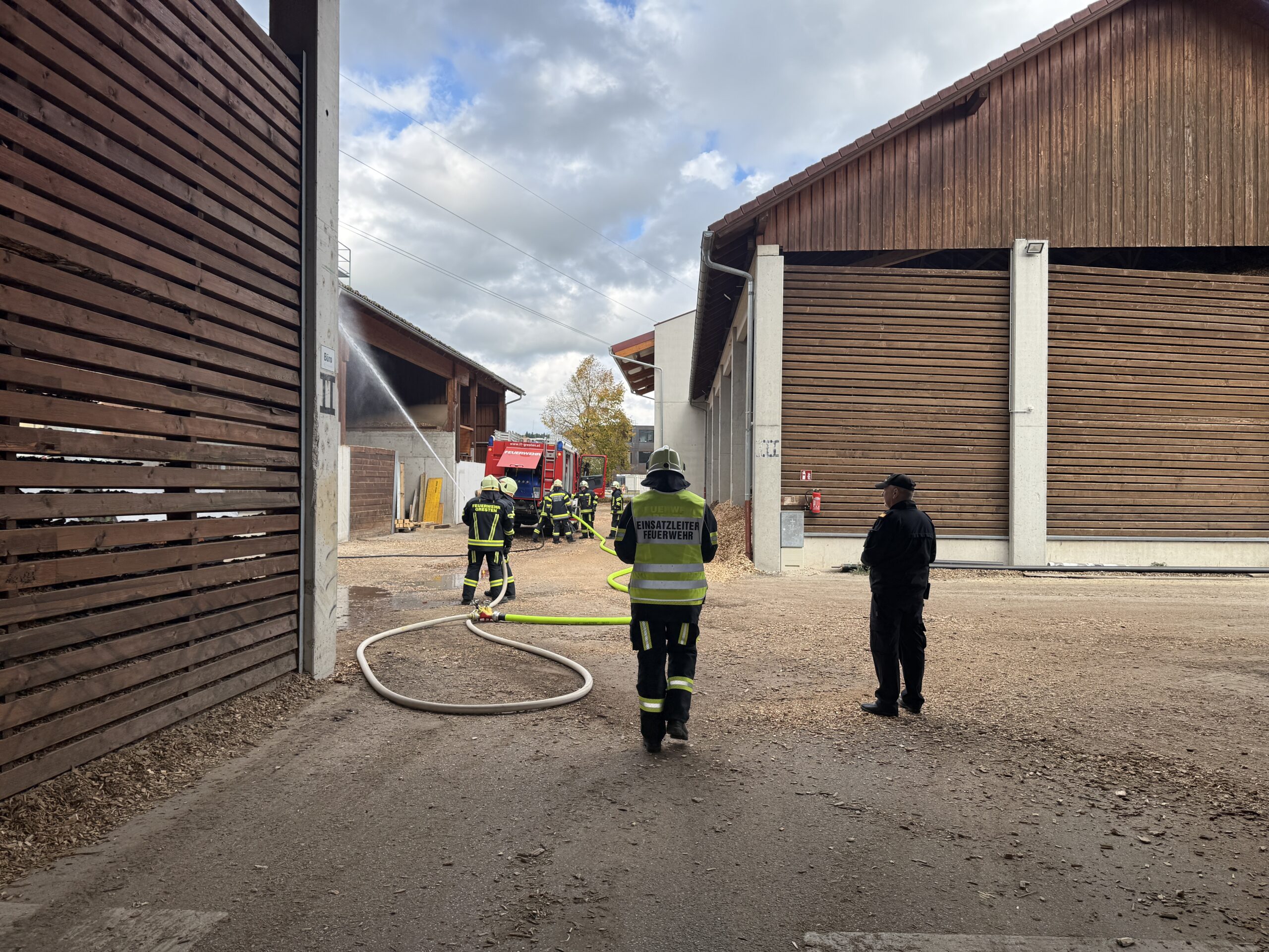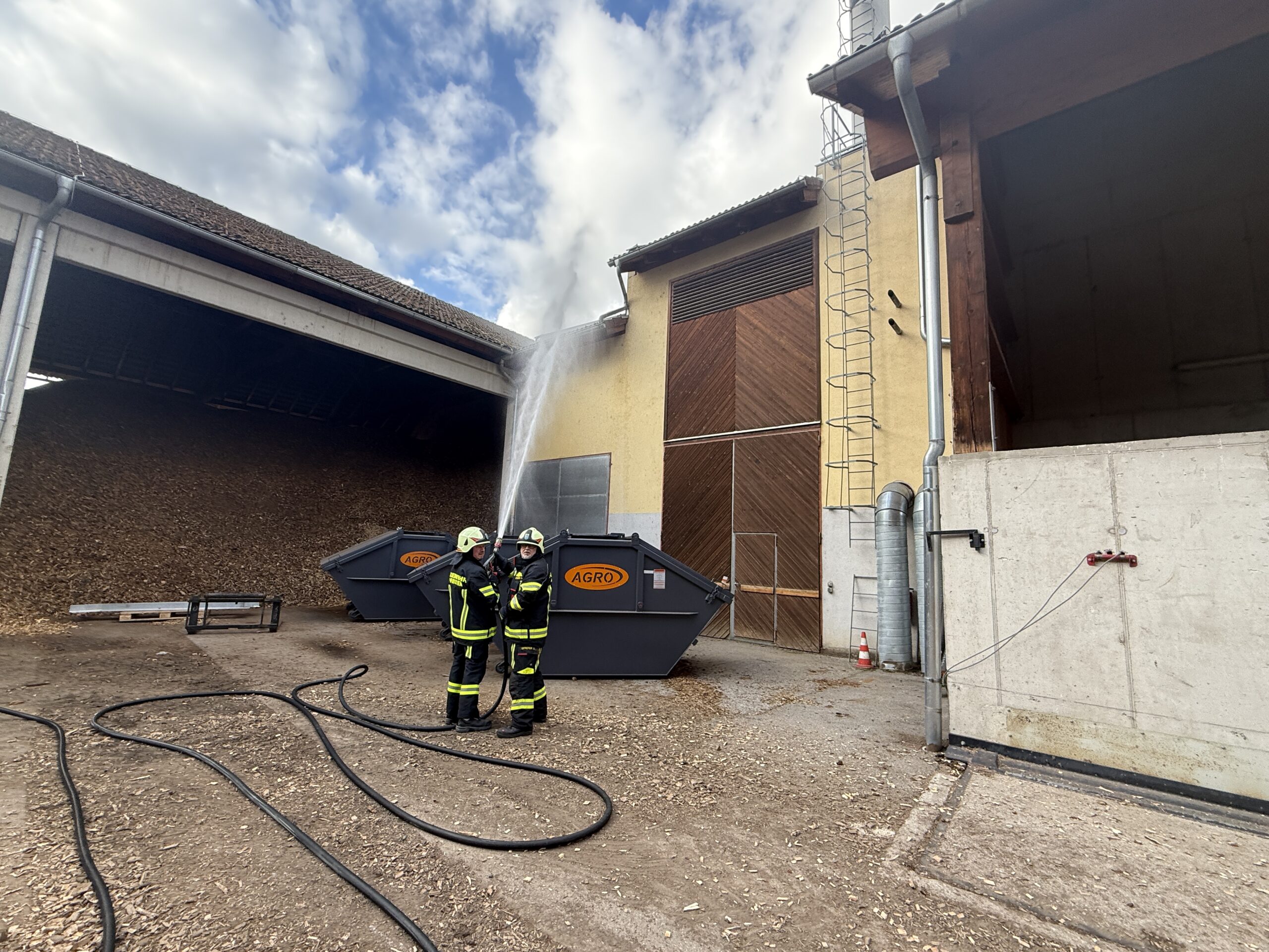 Noch immer war eine Person auf einem Silo gefangen, und noch immer galt es, umliegende Gebäude vor dem Übergreifen der Flammen zu schützen. Auch dafür wurden Fahrzeuge von verschiedenen Feuerwehren des Abschnitts eingesetzt.