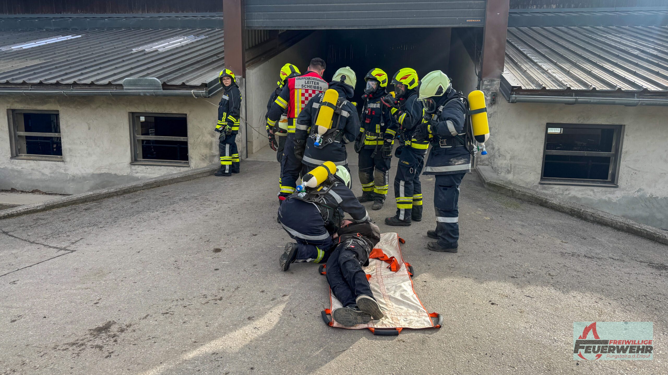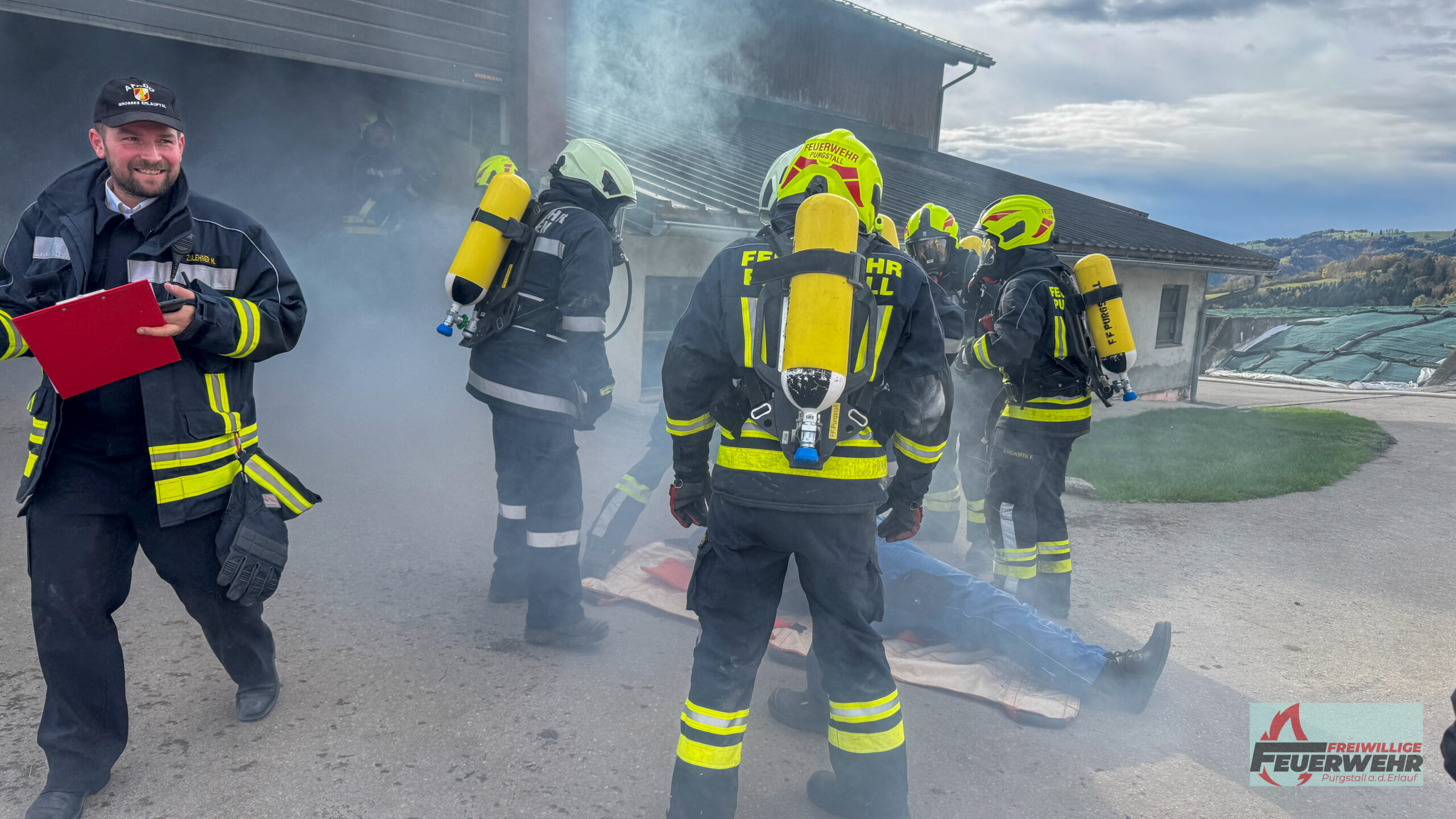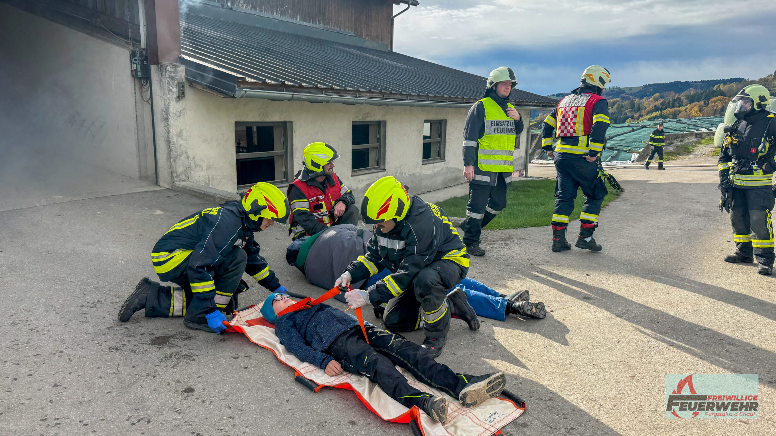 Simuliert wurde ein Brand in der Maschinenhalle mit mehreren vermissten Personen. Vier Personen konnten unter Atemschutz gerettet werden, während parallel der angrenzende Wohntrakt geschützt wurde.