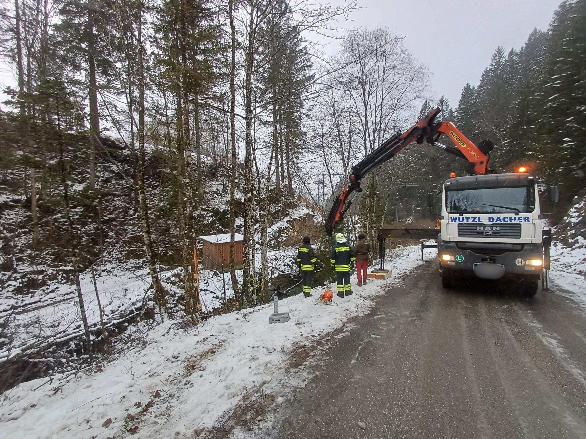 Aufgrund des Schneefalls musste zusätzlich der Schneepflug der Gemeinde Puchenstuben ausrücken, um die Fahrbahn mit Streusalz zu sichern und einen stabilen Standplatz für den Kran zu gewährleisten. Ein in Puchenstuben anwesendes Unternehmen aus Frankenfels unterstützte die Einsatzkräfte mit einem LKW samt Kran, wodurch das Unfallfahrzeug zügig geborgen werden konnte.