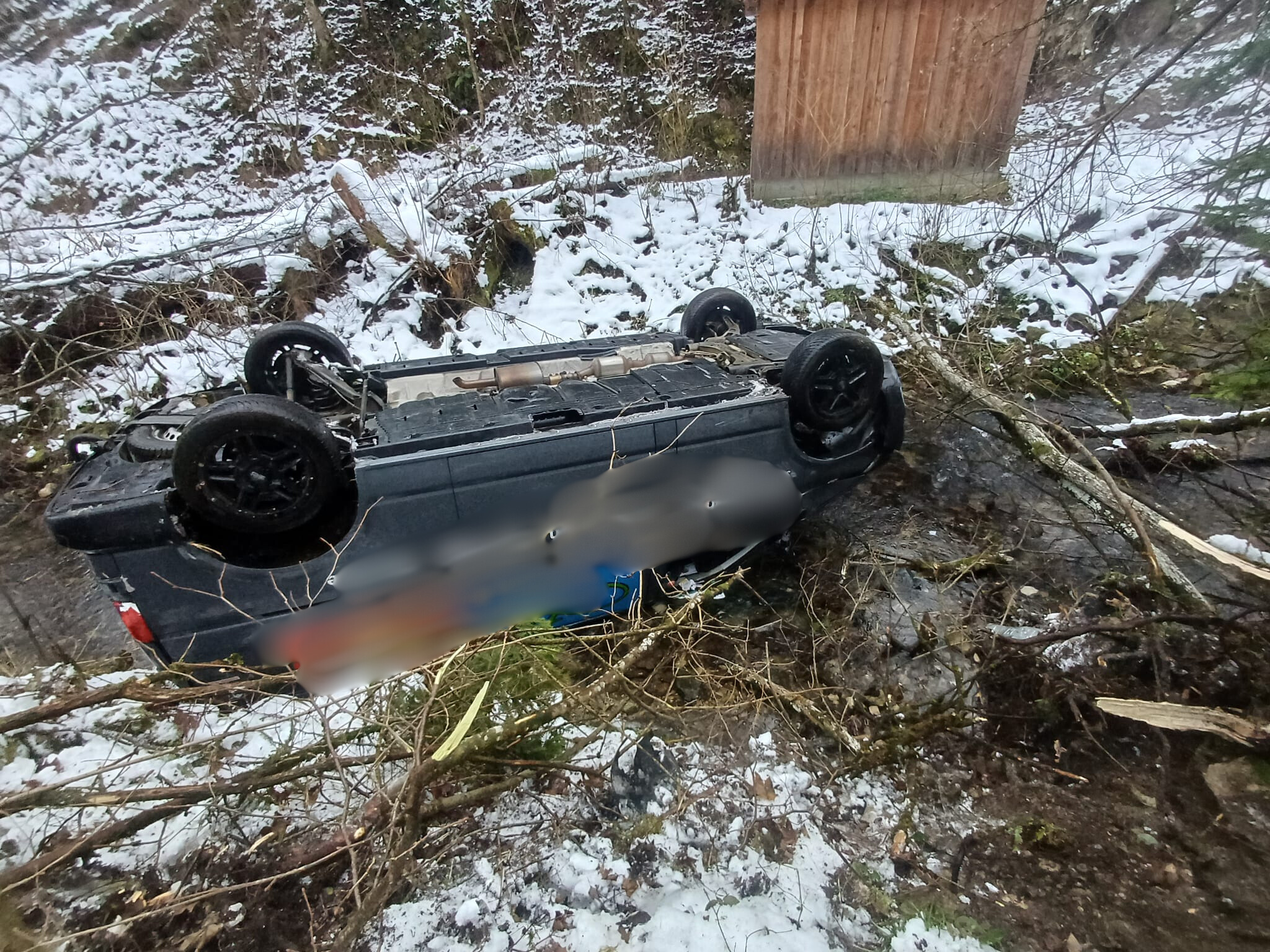 Beim Eintreffen der ersten Einsatzkräfte zeigte sich, dass ein Firmenfahrzeug aus bislang ungeklärter Ursache von der Fahrbahn abgekommen und im Bachbett auf dem Dach zu liegen gekommen war. Die beiden jungen Insassen konnten das Fahrzeug selbstständig verlassen. Die zuerst eintreffende Feuerwehr Puchenstuben gab rasch Entwarnung, wodurch die Feuerwehren Frankenfels und St. Anton/Jessnitz, die sich bereits auf der Anfahrt befanden, storniert werden konnten.
