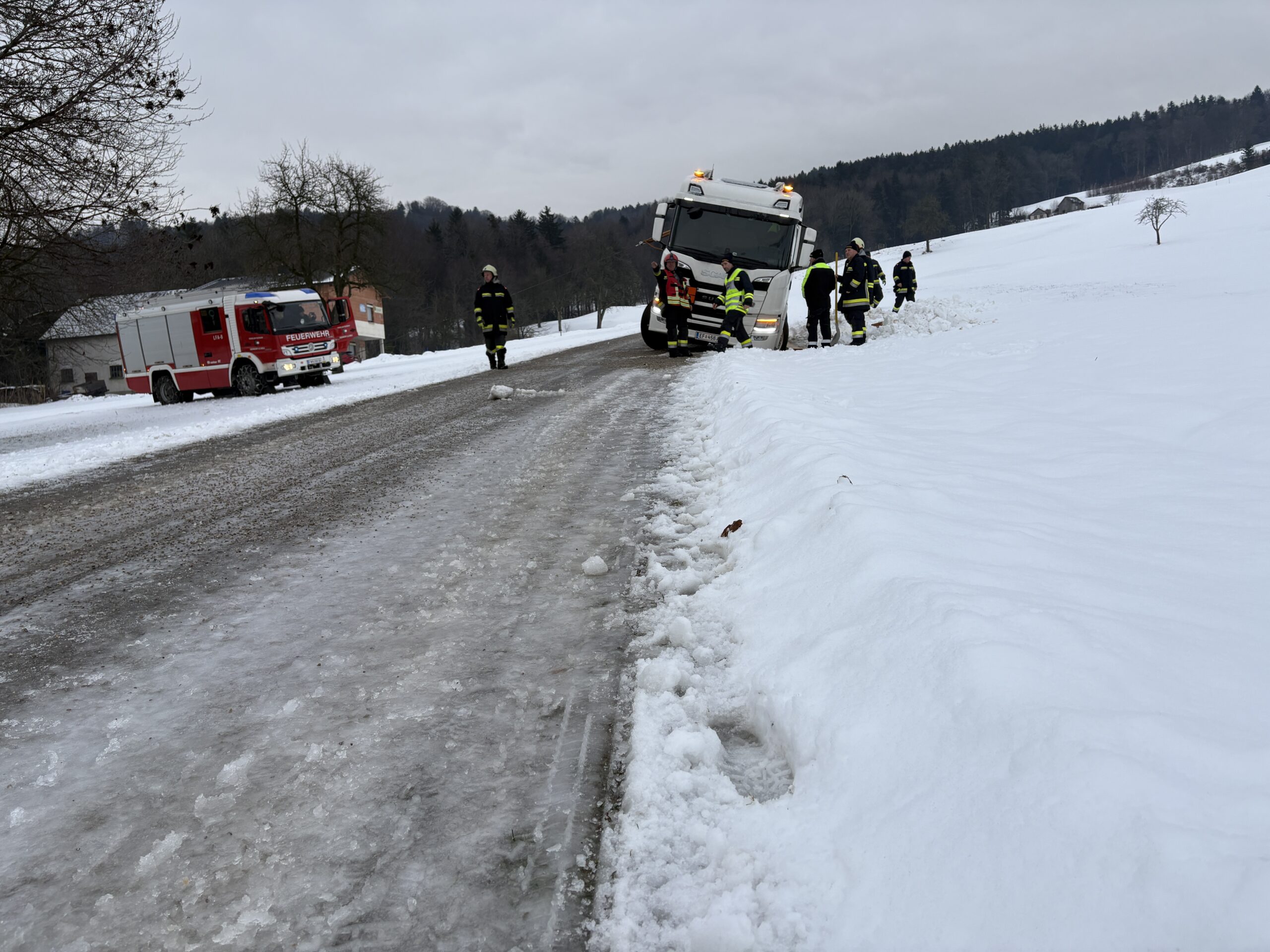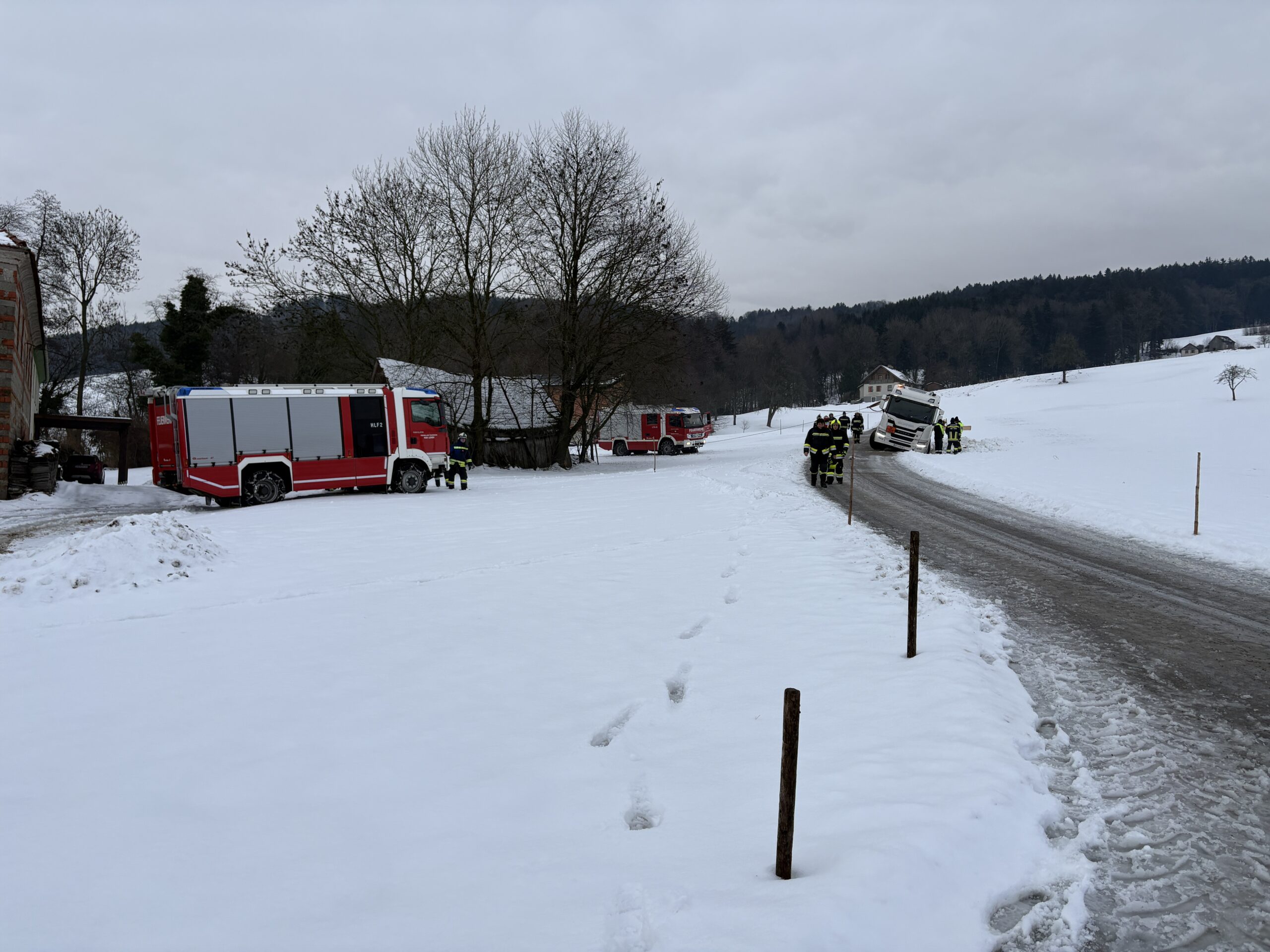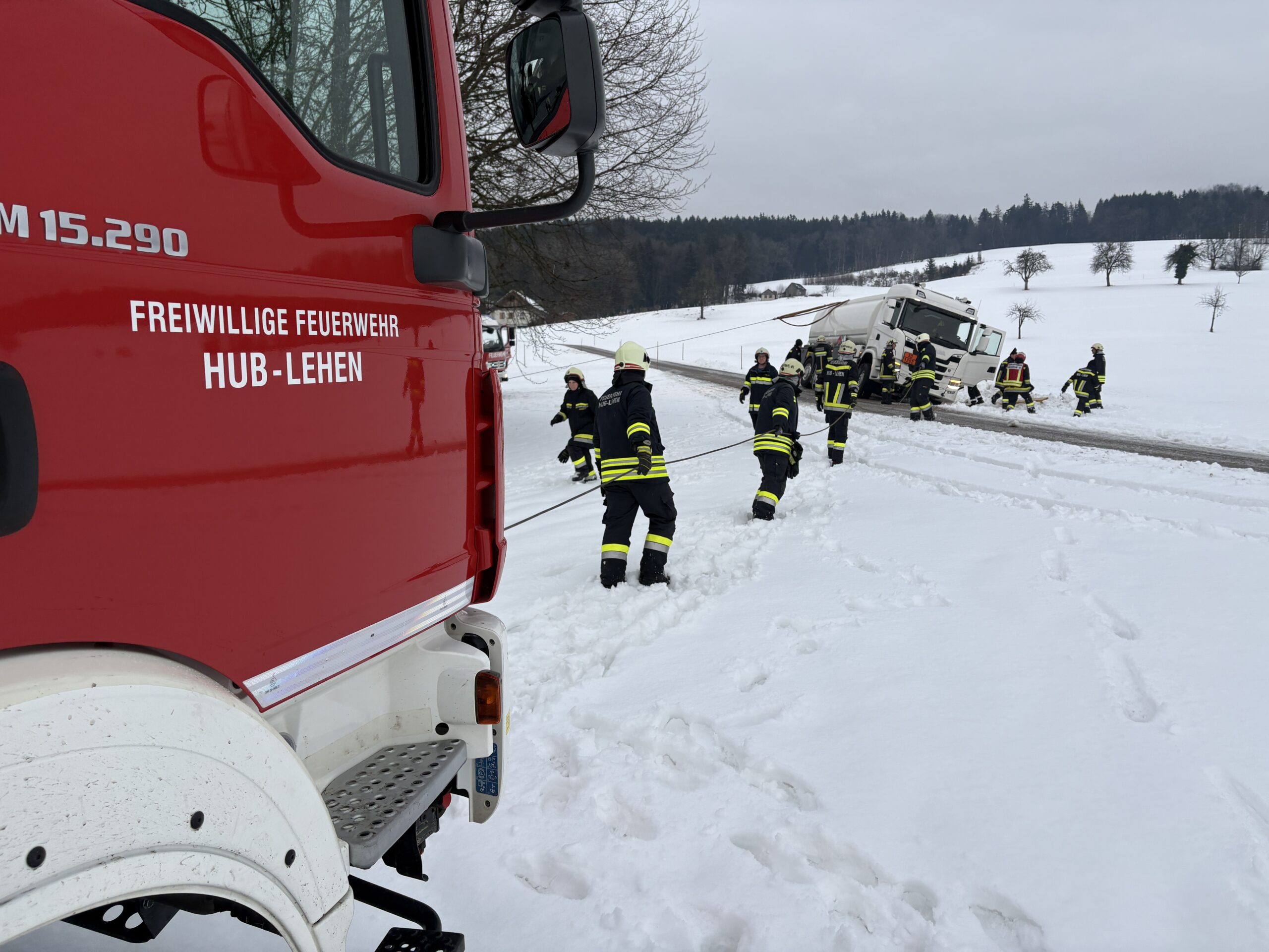 Am Dienstagmorgen um 8:06 Uhr wurde die Feuerwehr Hub-Lehen mit dem Stichwort T1 Bergung – Großfahrzeug zu einer LKW-Bergung alarmiert.