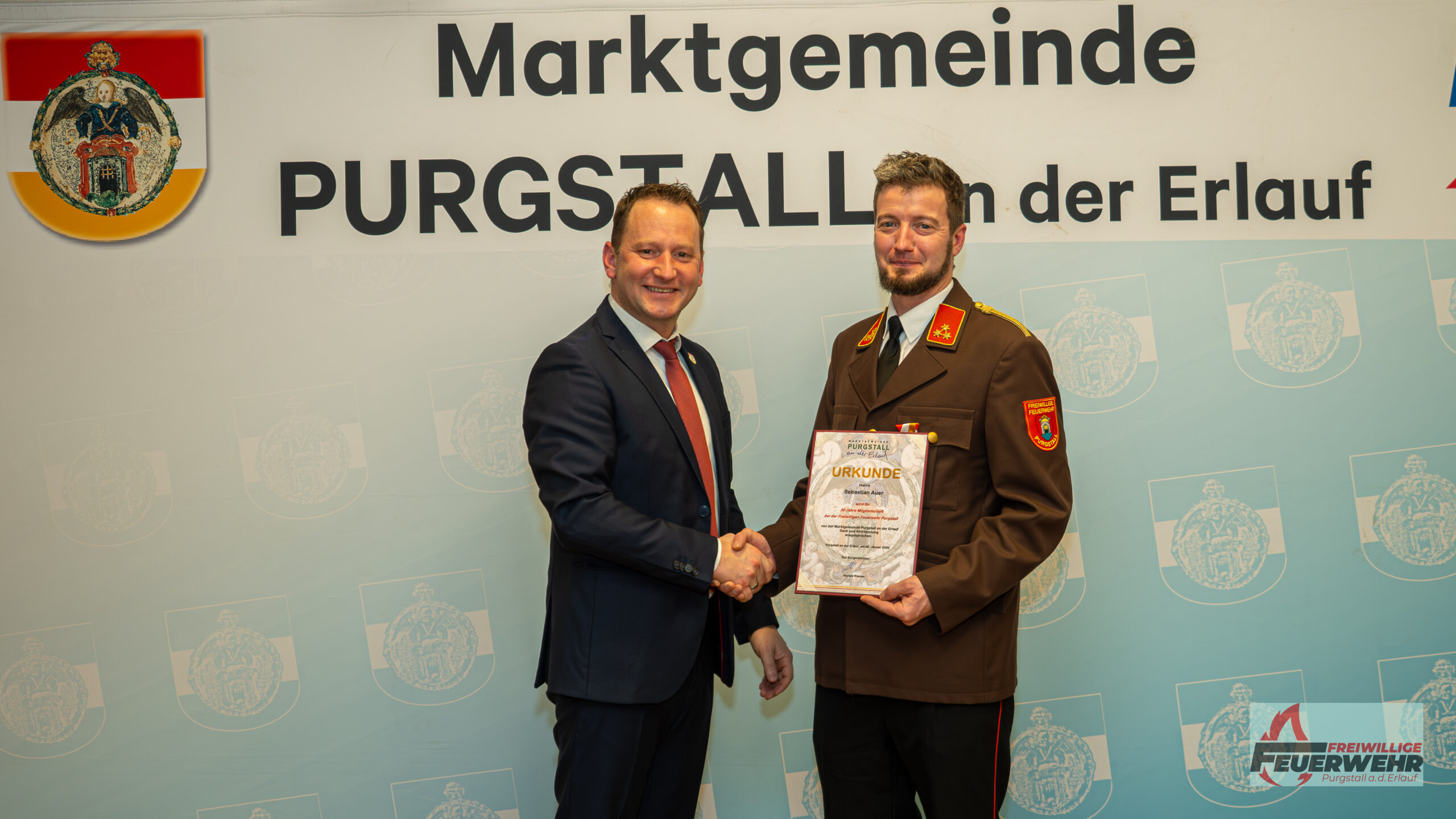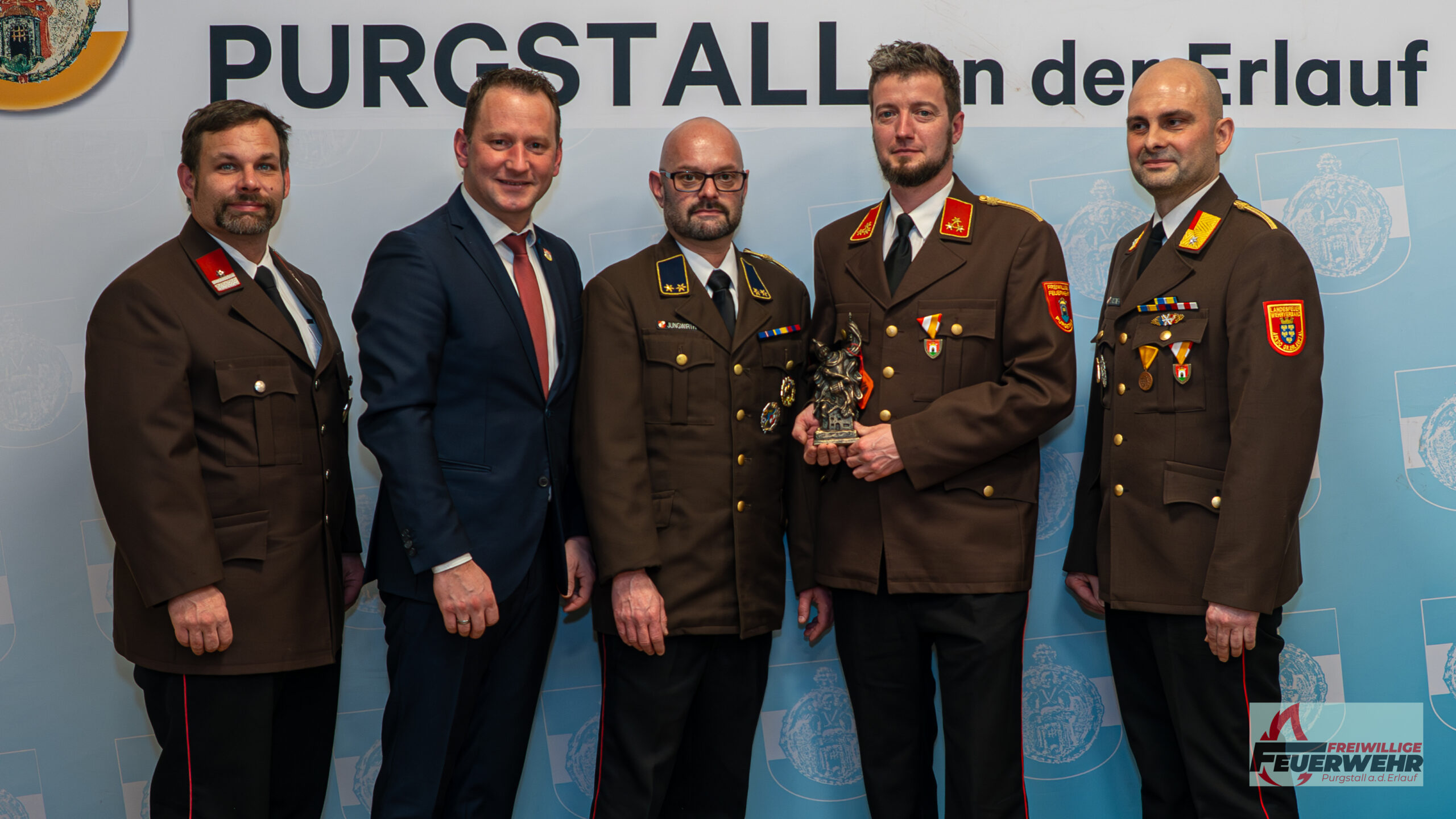 Zum Abschluss der Versammlung wurde Sebastian Auer für seine langjährige Tätigkeit besonders geehrt. Bürgermeister Harald Riemer überreichte ihm eine Urkunde für 30 Jahre Mitgliedschaft bei der Feuerwehr Purgstall. Zusätzlich erhielt er von der Feuerwehr als Zeichen der Wertschätzung eine bronzene Statue des Hl. Florian.