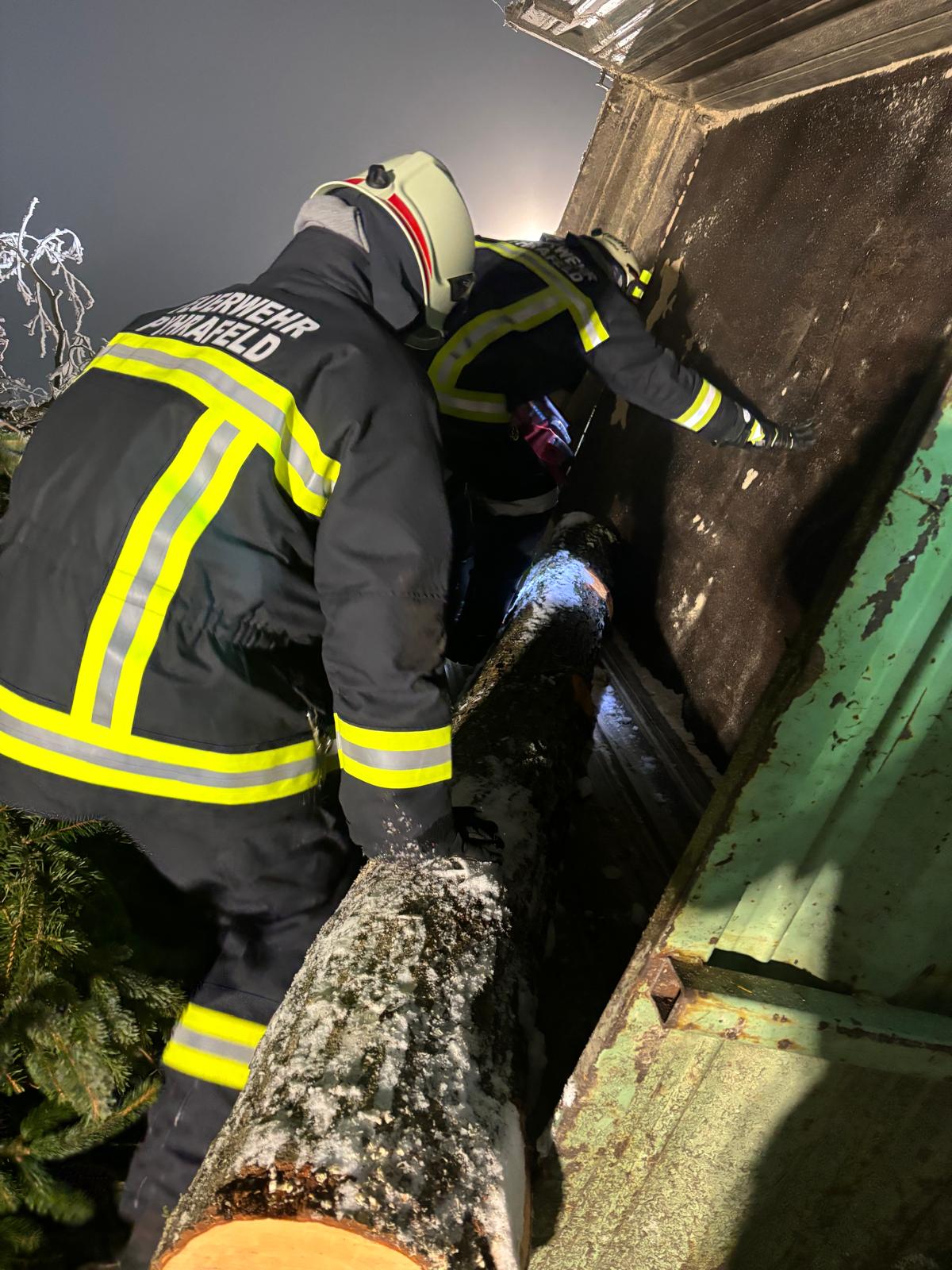 Für die Befreiung der Person kam die Kettensäge zum Einsatz. Achtsam wurde der Baumstamm in handliche Stücke zerlegt, um den Druck von der eingeklemmten Person zu nehmen und sie sicher retten zu können.