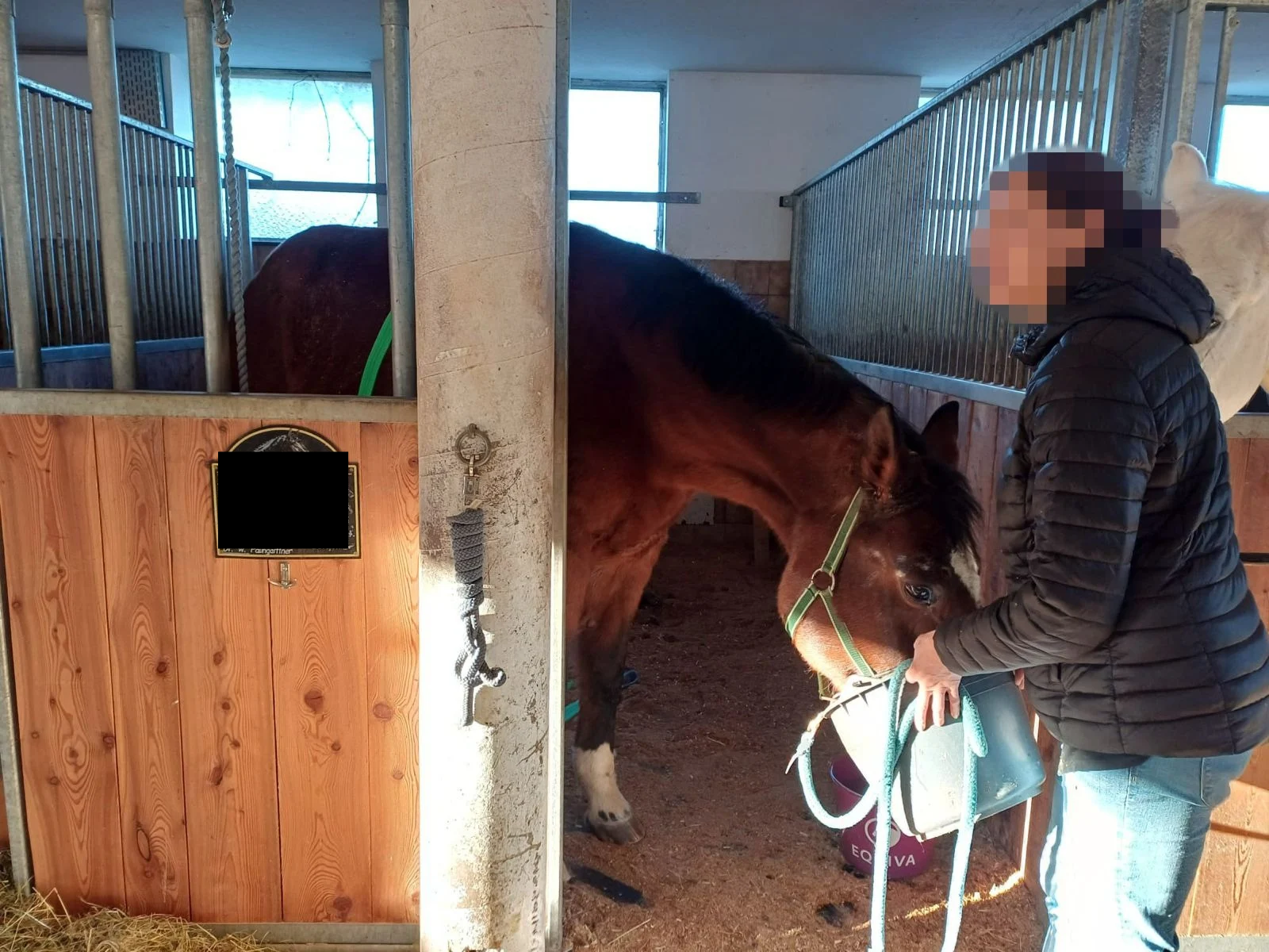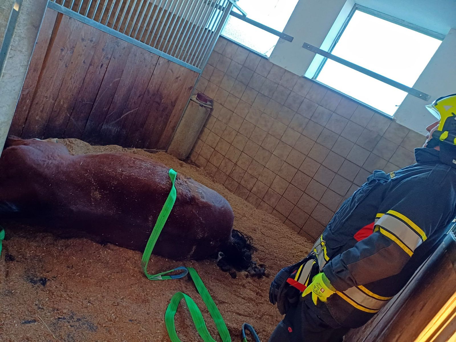 Am Einsatzort angekommen, lag ein Pferd in seiner Box und konnte nicht mehr selbstständig aufstehen. In Rücksprache mit der Tierärztin wurde das Tier vorsichtig gedreht und aus der Ecke gezogen.