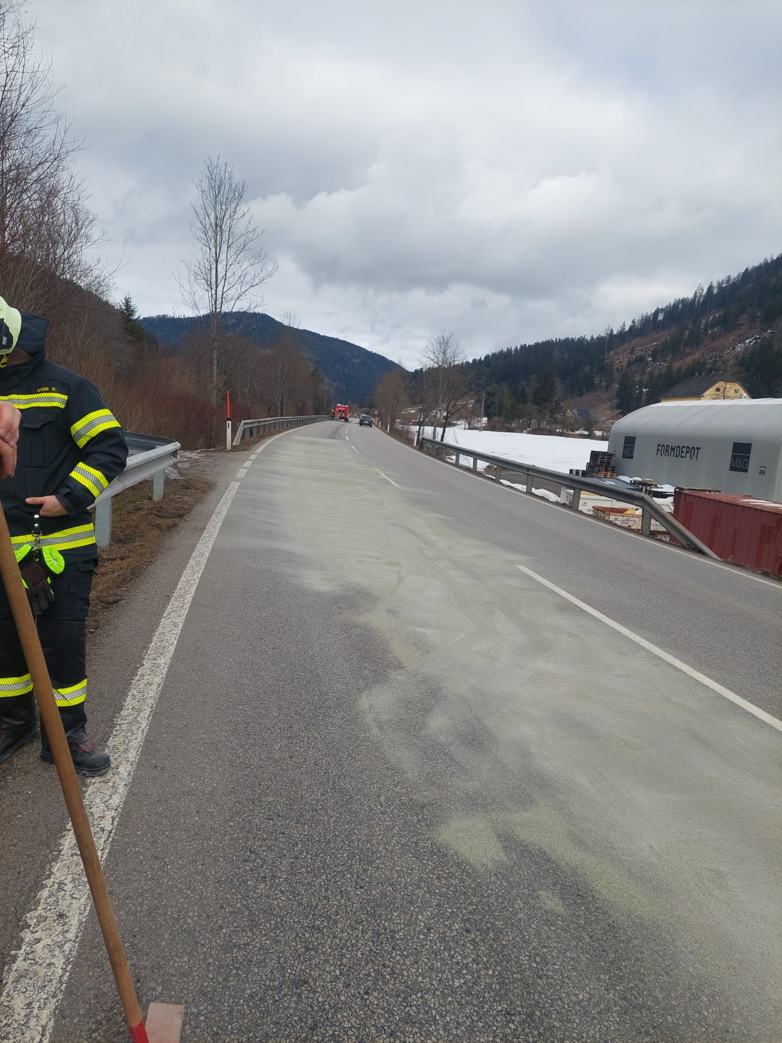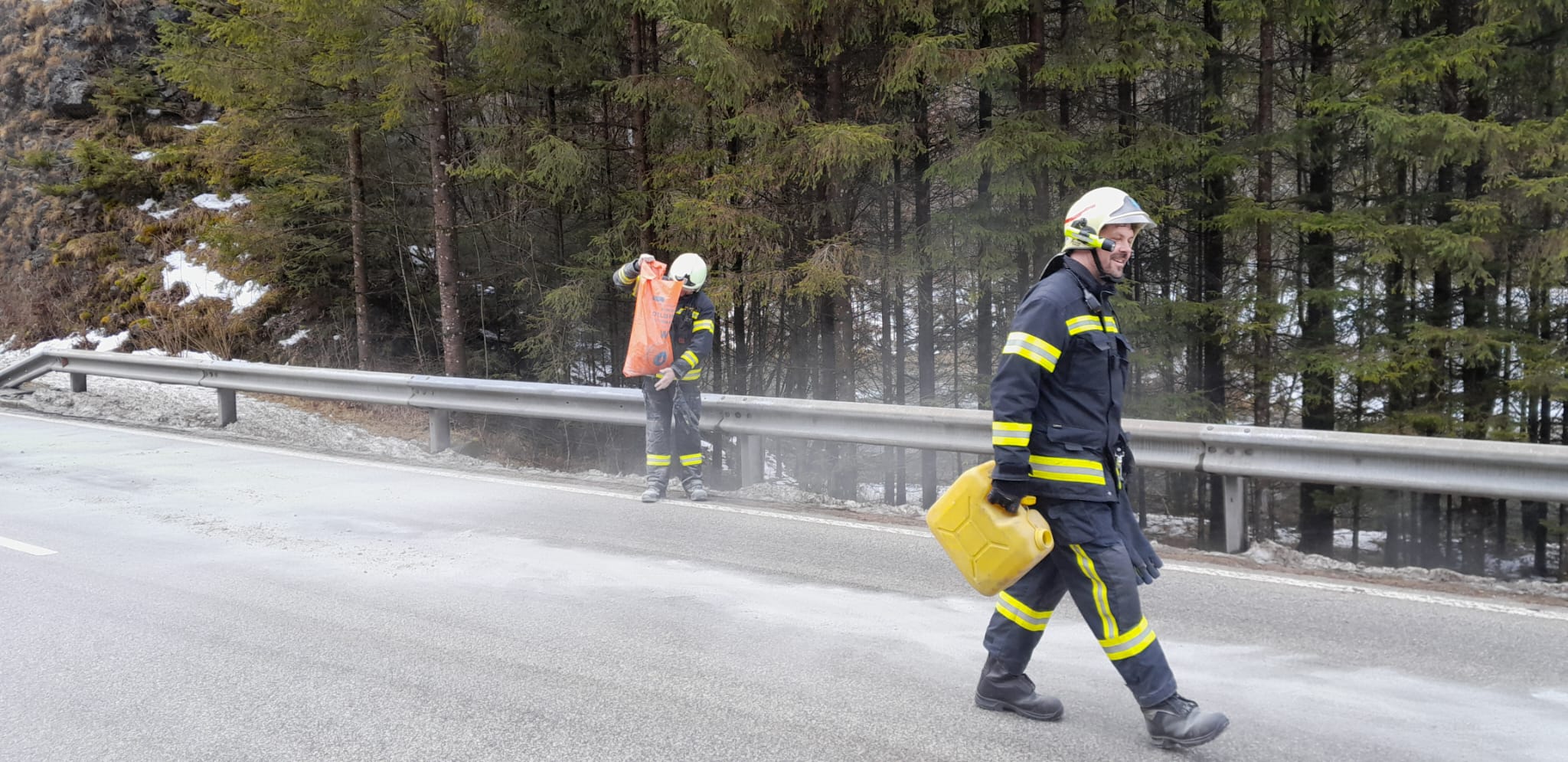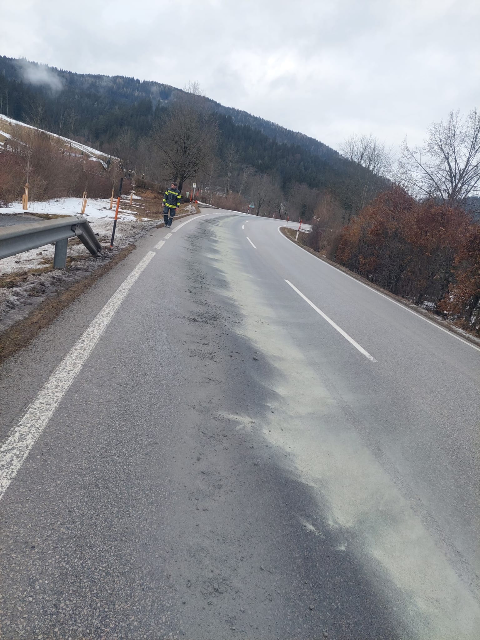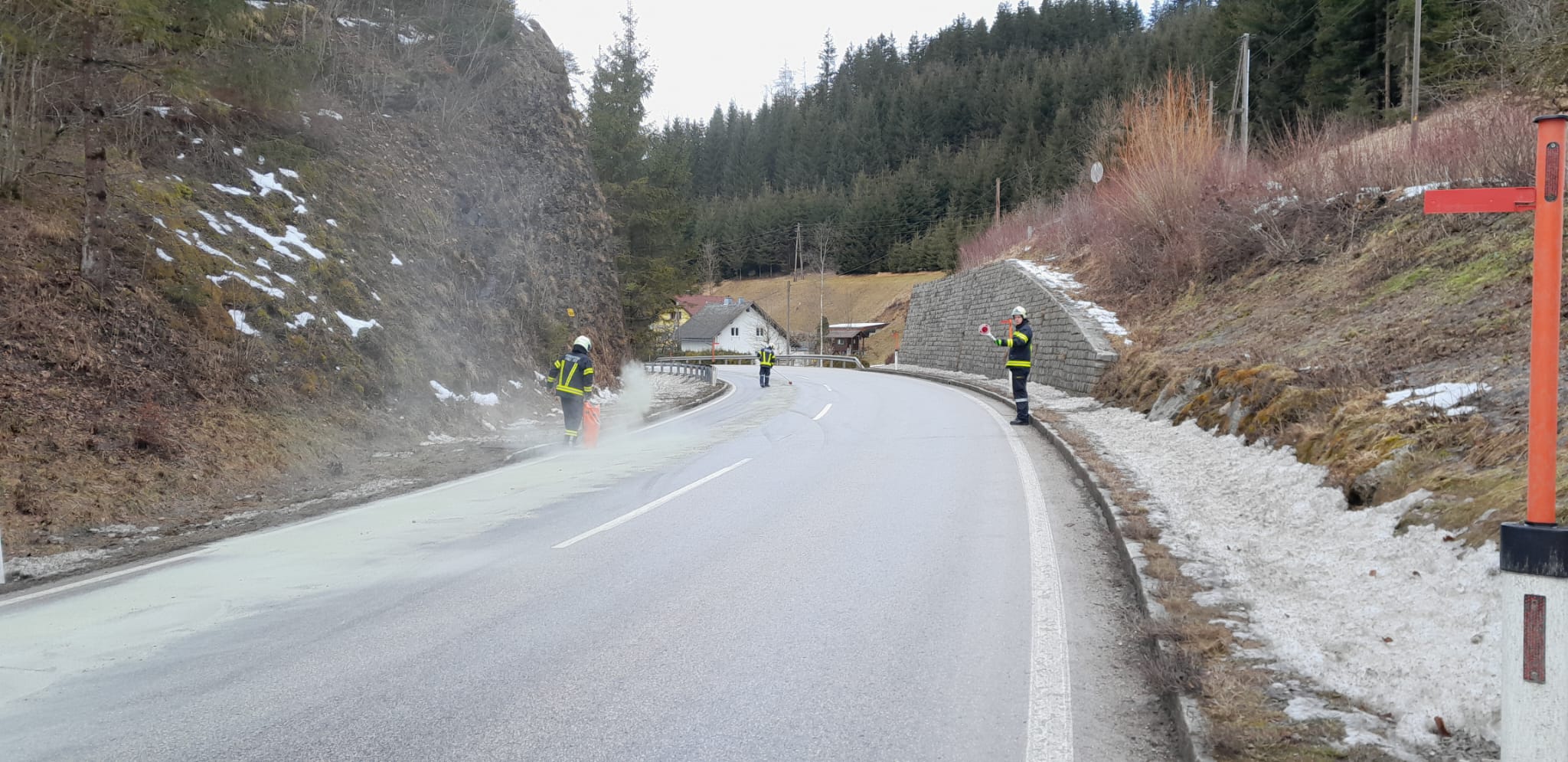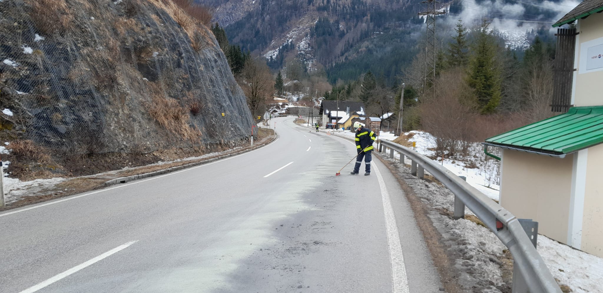 Nach dem erfolgreichen Binden der Betriebsmittel wurde die Fahrbahn mittels Hochdruckschlauch gereinigt. Während der Aufräumarbeiten wurde die Straßenmeisterei verständigt, welche nach ihrem Eintreffen eine Geschwindigkeitsbeschränkung von 30 km/h einrichtete, um weitere Unfälle zu verhindern.