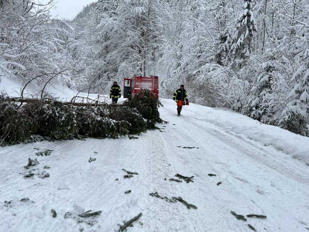 Aufgrund der sehr schwierigen Fahrbahnverhältnisse dauerte es ausnahmsweise etwas länger, bis unsere Florianis an der Einsatzstelle angekommen waren. Dort lag eine Fichte auf der Fahrbahn, die wohl von den Schneemassen umgedrückt wurde. Mittels Motorsäge wurde der Baum in kleinere Teile geschnitten, sodass die Straße schon nach kurzer Zeit wieder frei war.