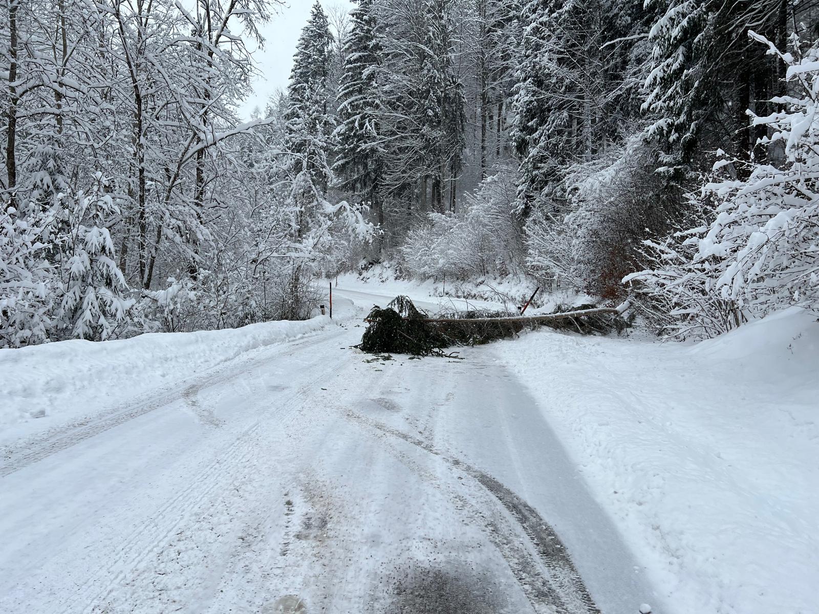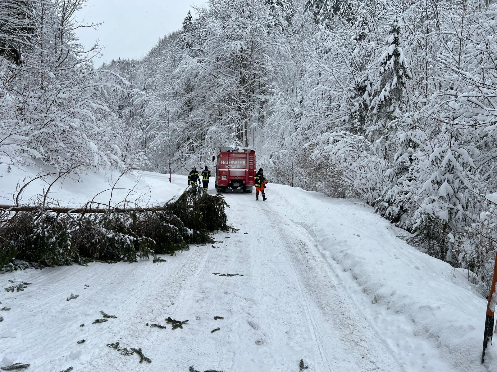 Aufgrund der sehr schwierigen Fahrbahnverhältnisse dauerte es ausnahmsweise etwas länger, bis unsere Florianis an der Einsatzstelle angekommen waren. Dort lag eine Fichte auf der Fahrbahn, die wohl von den Schneemassen umgedrückt wurde. Mittels Motorsäge wurde der Baum in kleinere Teile geschnitten, sodass die Straße schon nach kurzer Zeit wieder frei war.