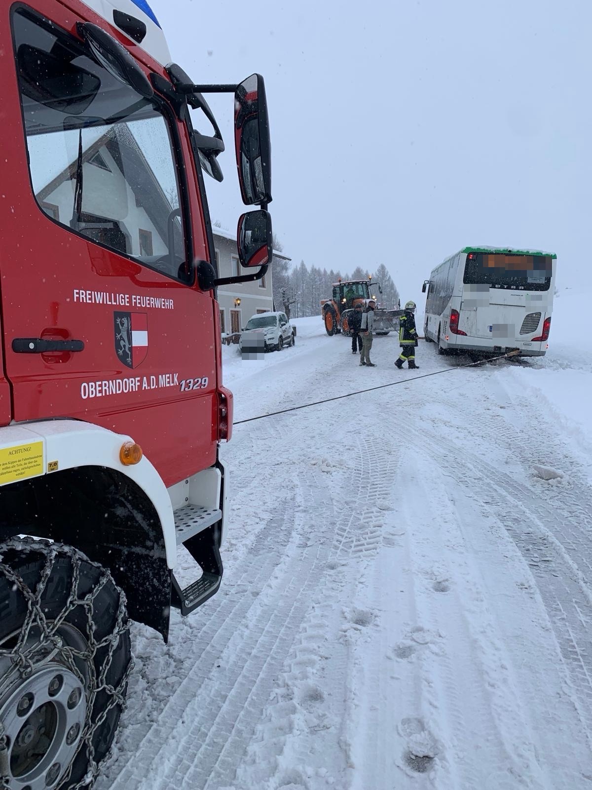 Gemeinsam mit dem Gemeindetraktor und unserem LFAB konnte der Bus mithilfe der Seilwinde wieder auf die Straße zurückgezogen werden und seine Fahrt fortsetzen.