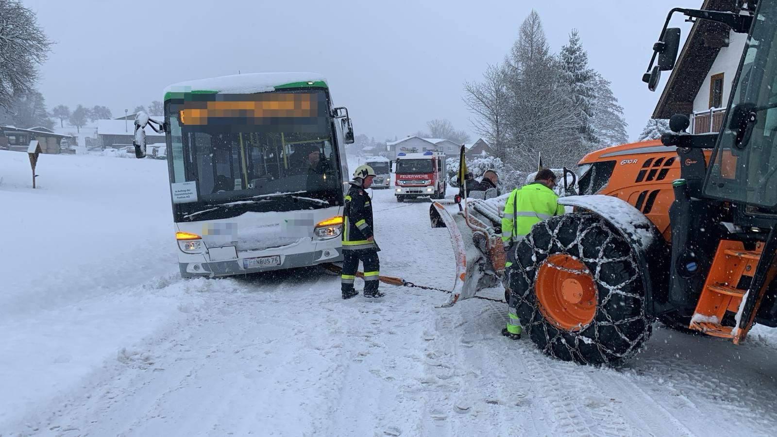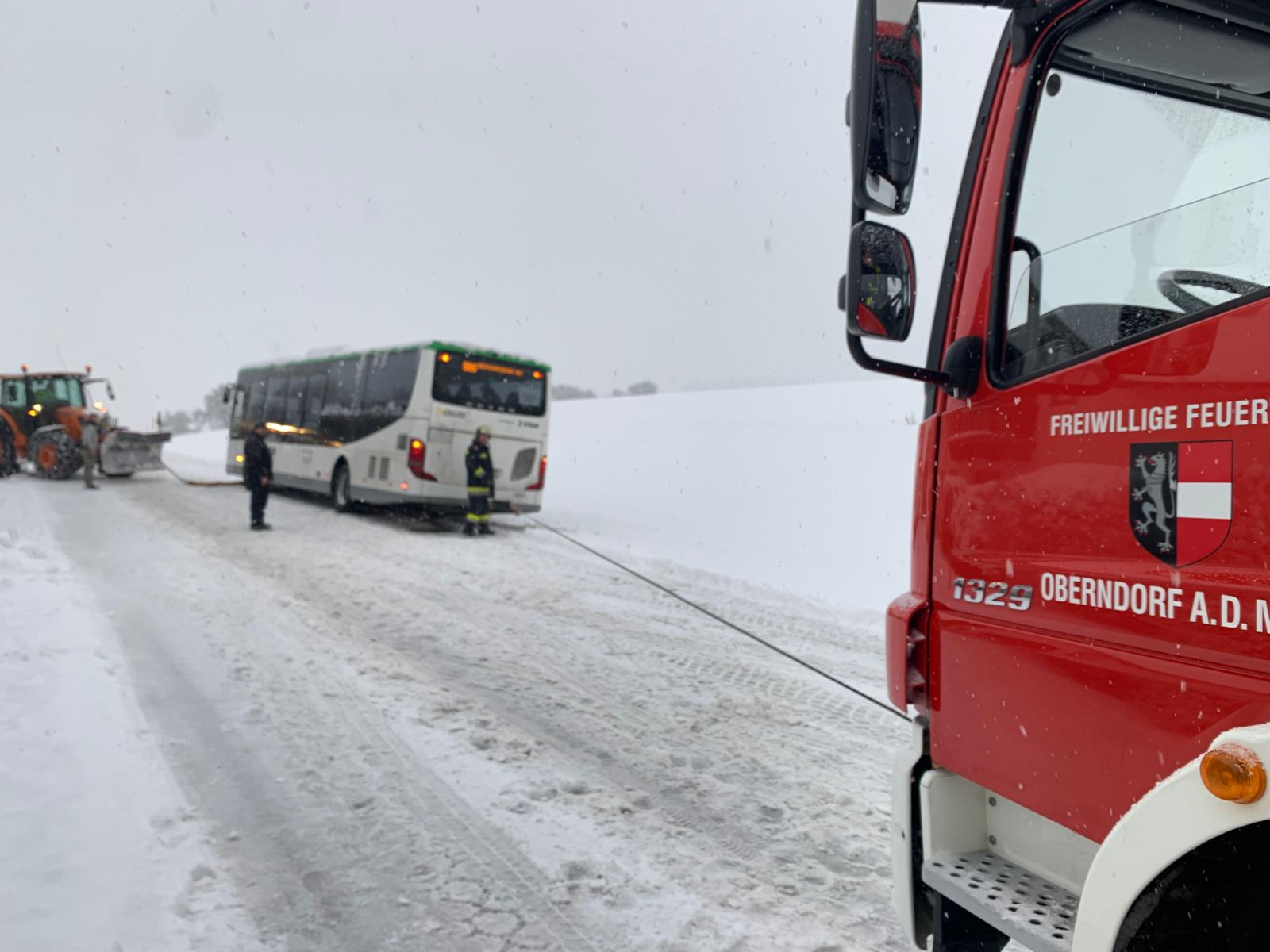 Fahrzeugbergung durch Schneefall – Linienbus in Graben gerutscht