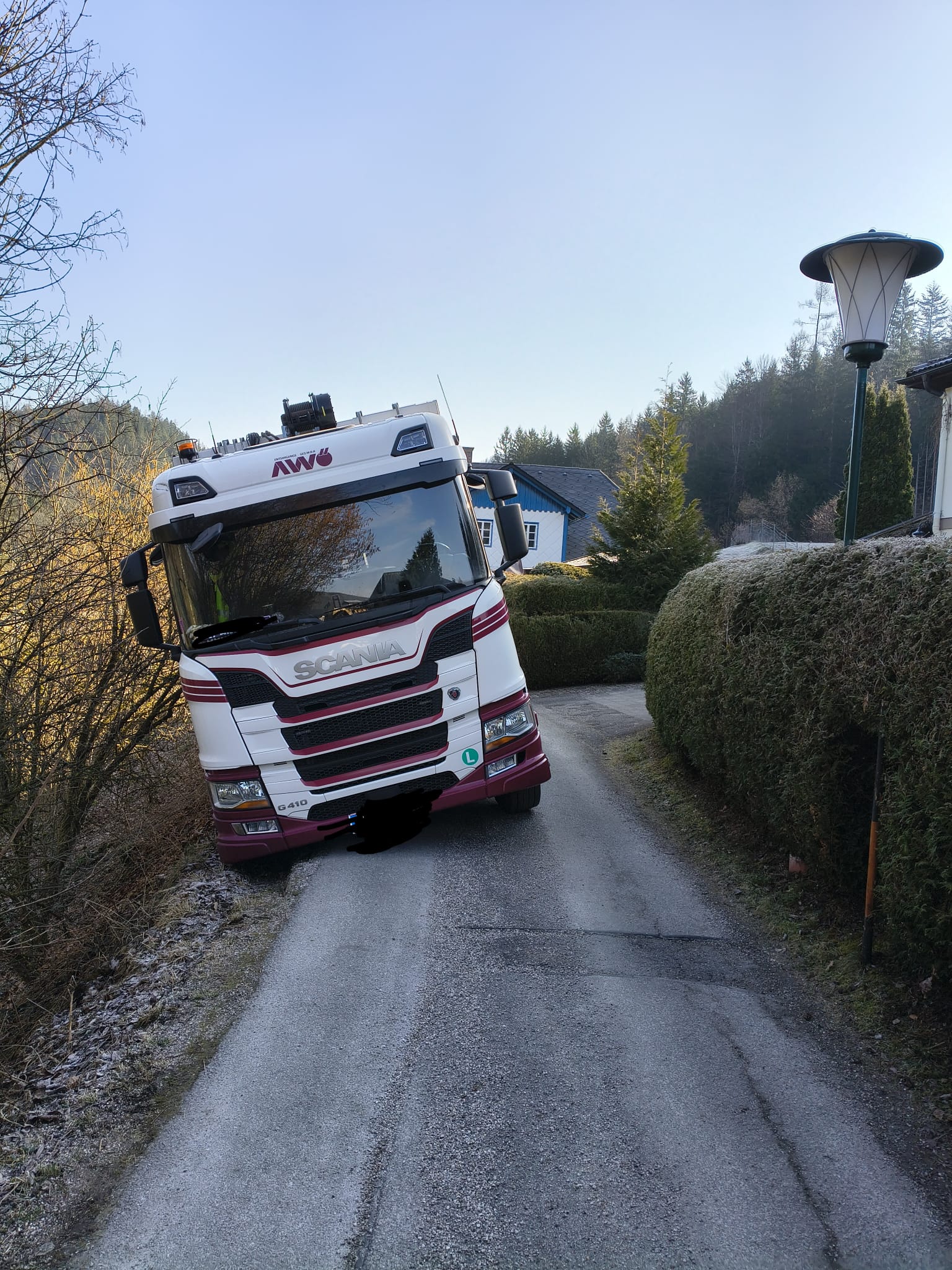 Bereits im Vorfeld wurde abgeklärt, ob es möglich ist, den LKW mittels Kranfahrzeug auf die Straße zu heben. Aufgrund des begrenzten Platzangebotes war das Aufstellen eines Autokrans jedoch nicht möglich.